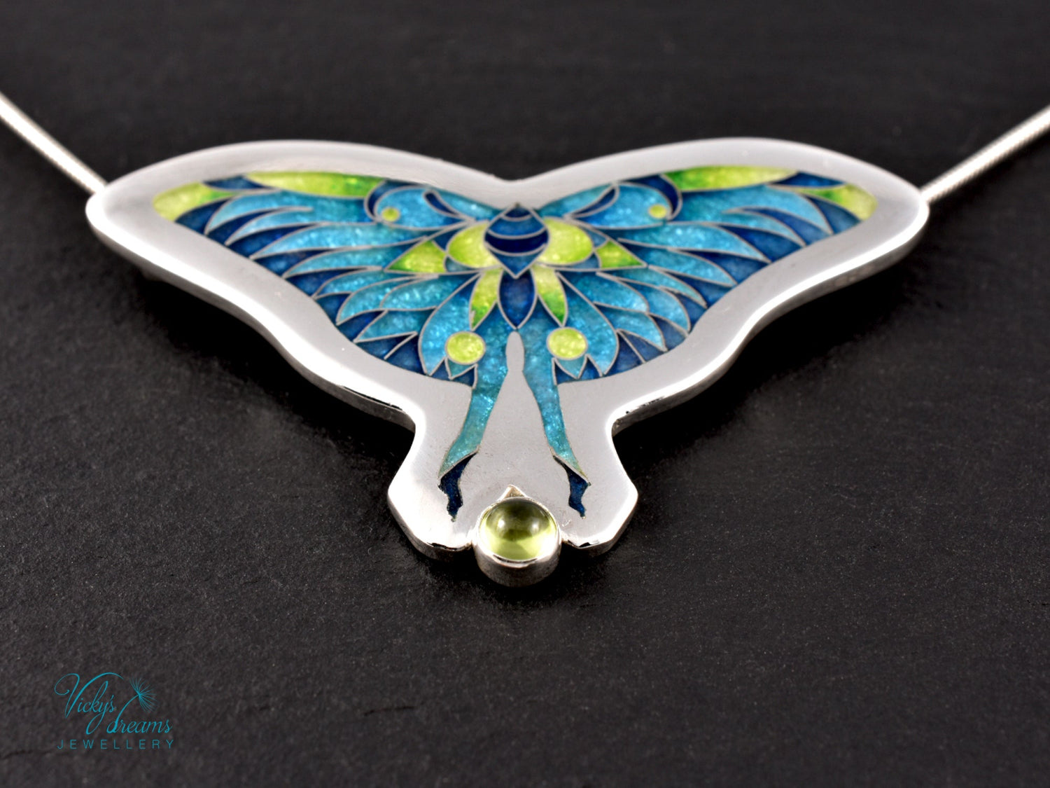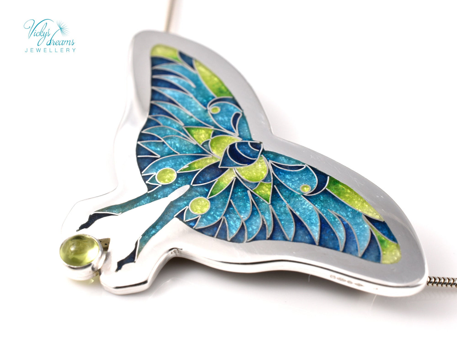 STUNNING Handcrafted Cloisonné & Champlevé Butterfly Pendant, gorgeous design with green/blue accents and peridot gemstone. This is high quality silver, reflecting the light. Another outstanding and eyecatching pendant from Vicky, thanks