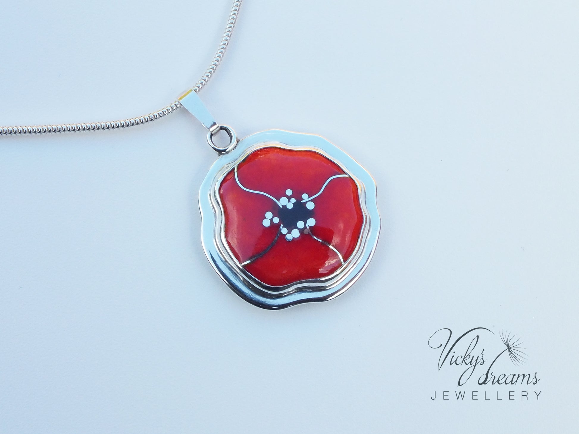 Handmade Cloisonné enamel pendant with Poppy design, set in sterling silver bezel.
