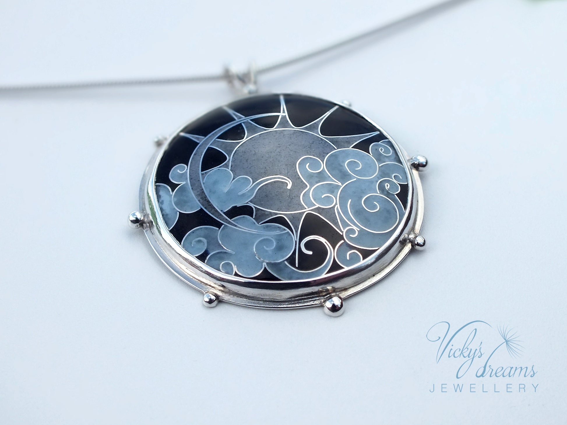 Cloisonné enamel necklace with Grayscale Sun & Clouds design, set in sterling silver bezel.