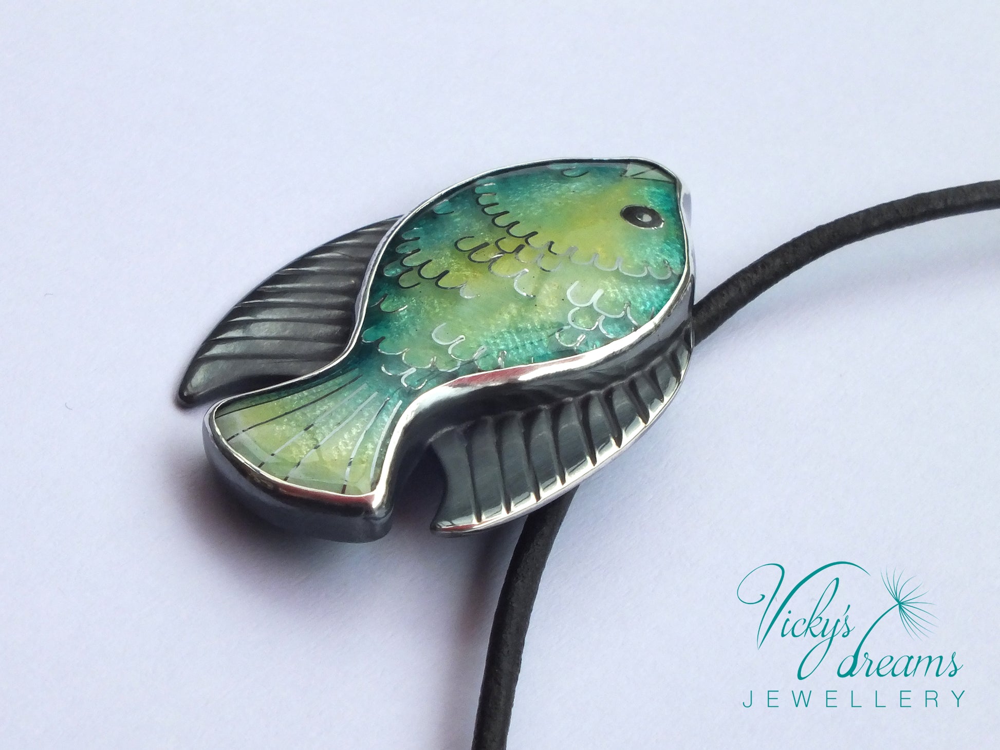 Handmade Cloisonné enamel necklace with Fish design, set in sterling silver bezel (oxidised to highlight the pattern).
