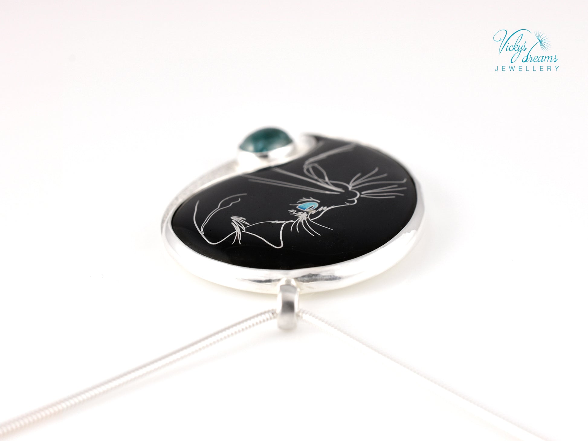 This unique cat portrait pendant is crafted in the spirit of mystery and curiosity, perfect for all cat lovers. The cat’s eye shines in translucent blue enamel, while the silhouette is formed from silver wire in black enamel, set in a polished sterling silver bezel. A beautiful apatite stone adds an extra touch of magic to this amulet.