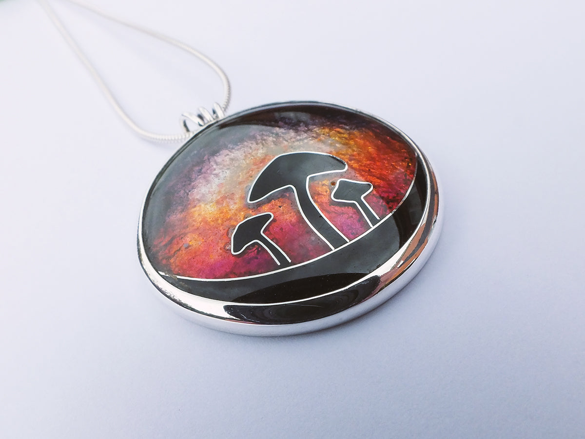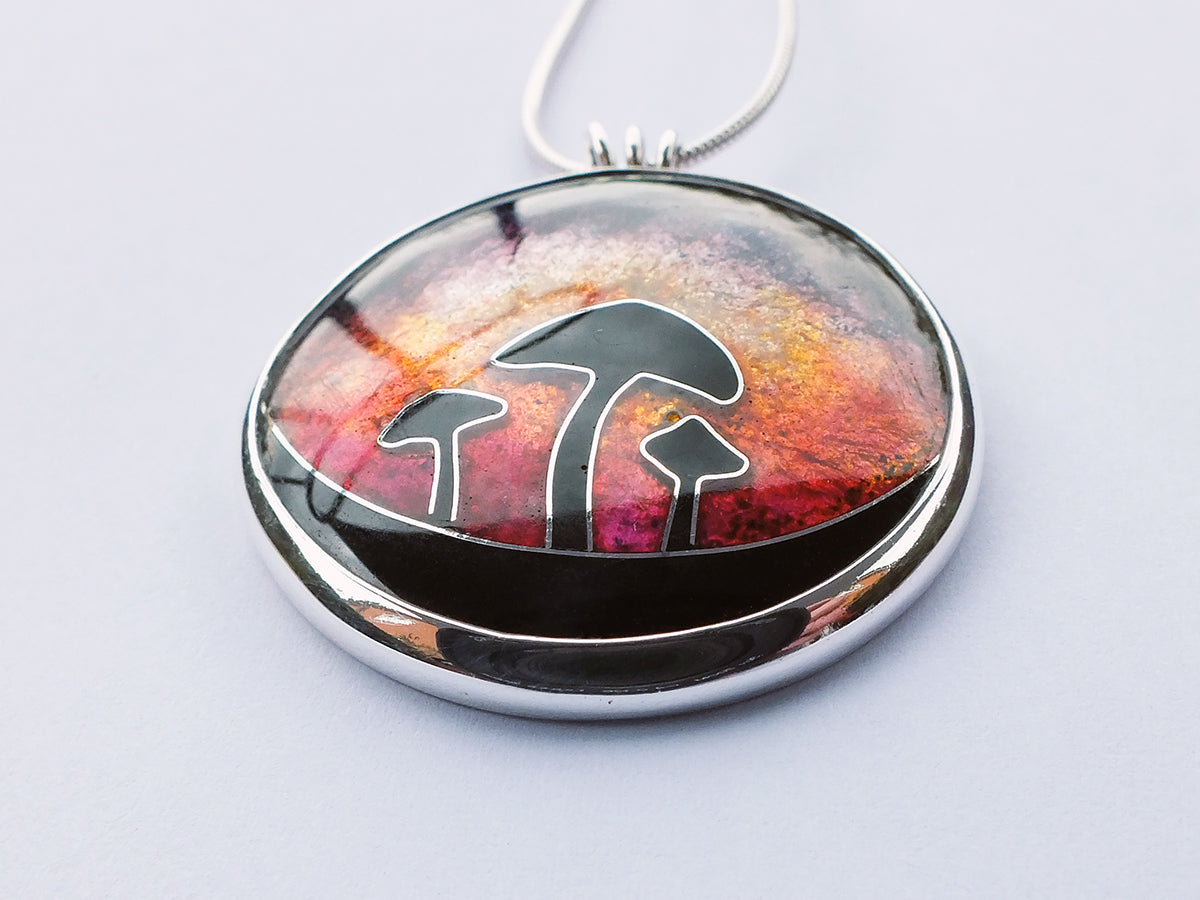 Handmade Cloisonné enamel necklace with Mushroom in sunset design, set in sterling silver bezel.