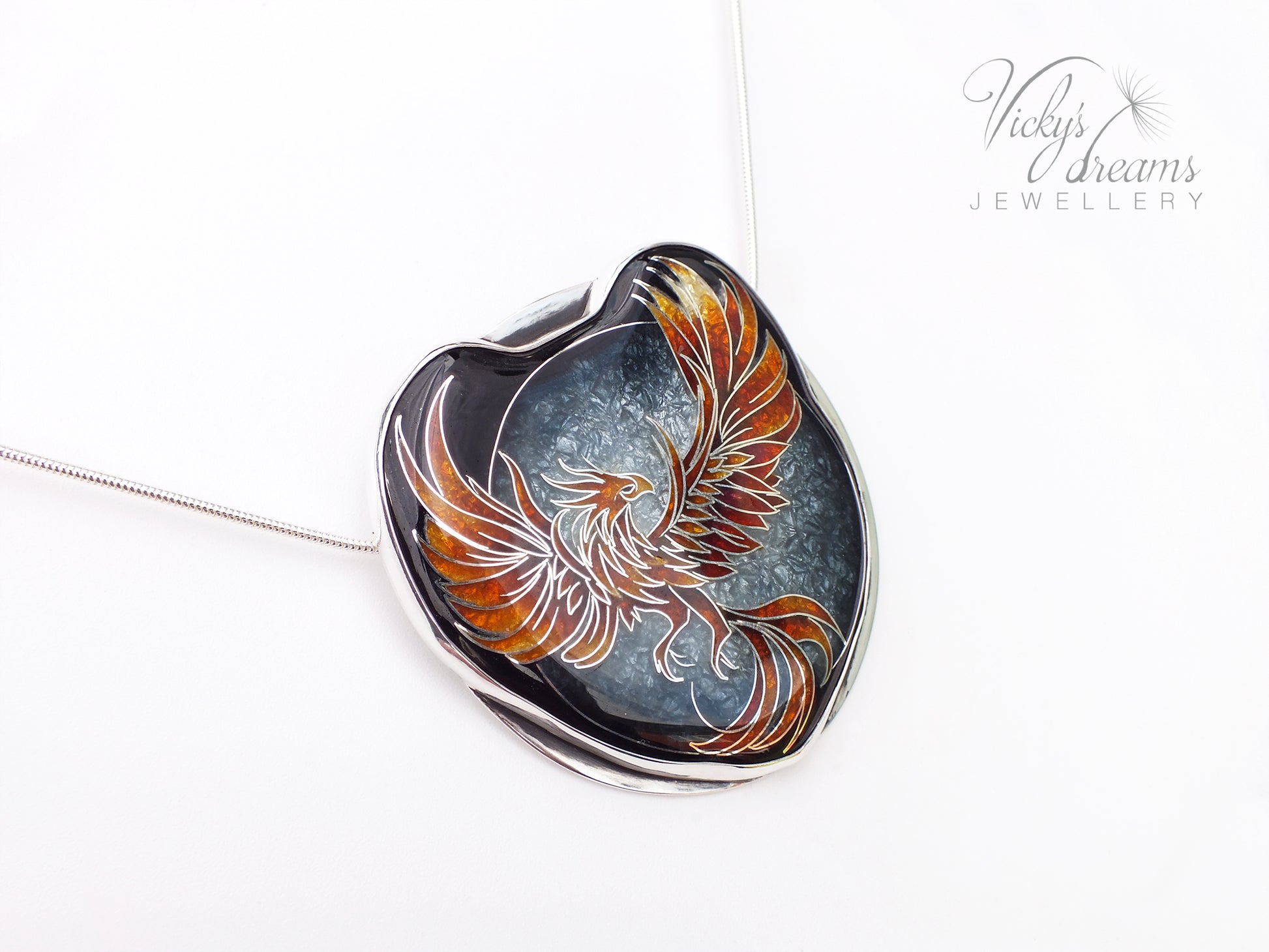 Cloisonné enamel necklace with vibrant colour phoenix design, set in sterling silver bezel.