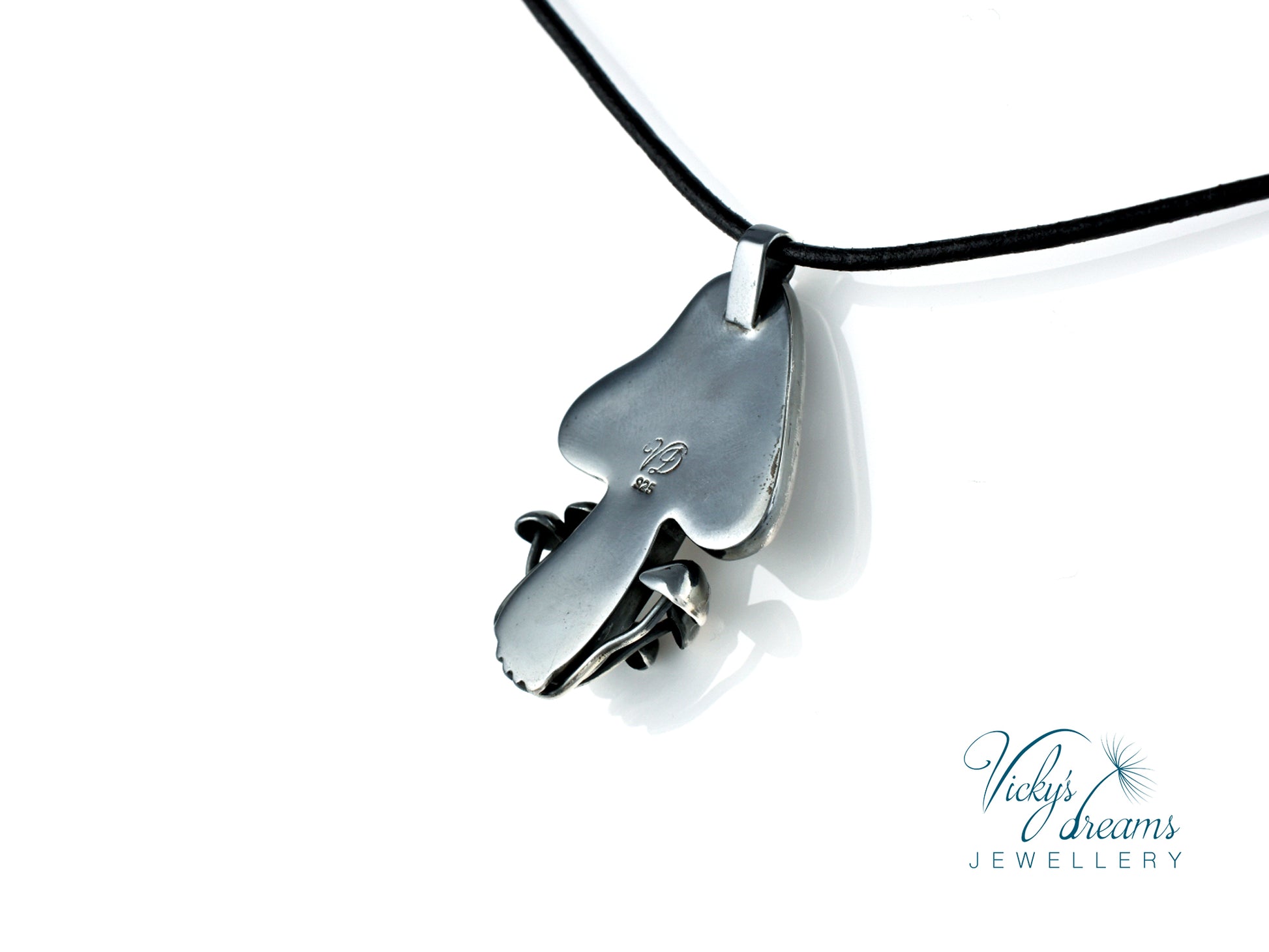 Cloisonné enamel necklace with blue mushroom design, set in sterling silver bezel, (oxidised to highlight the pattern).