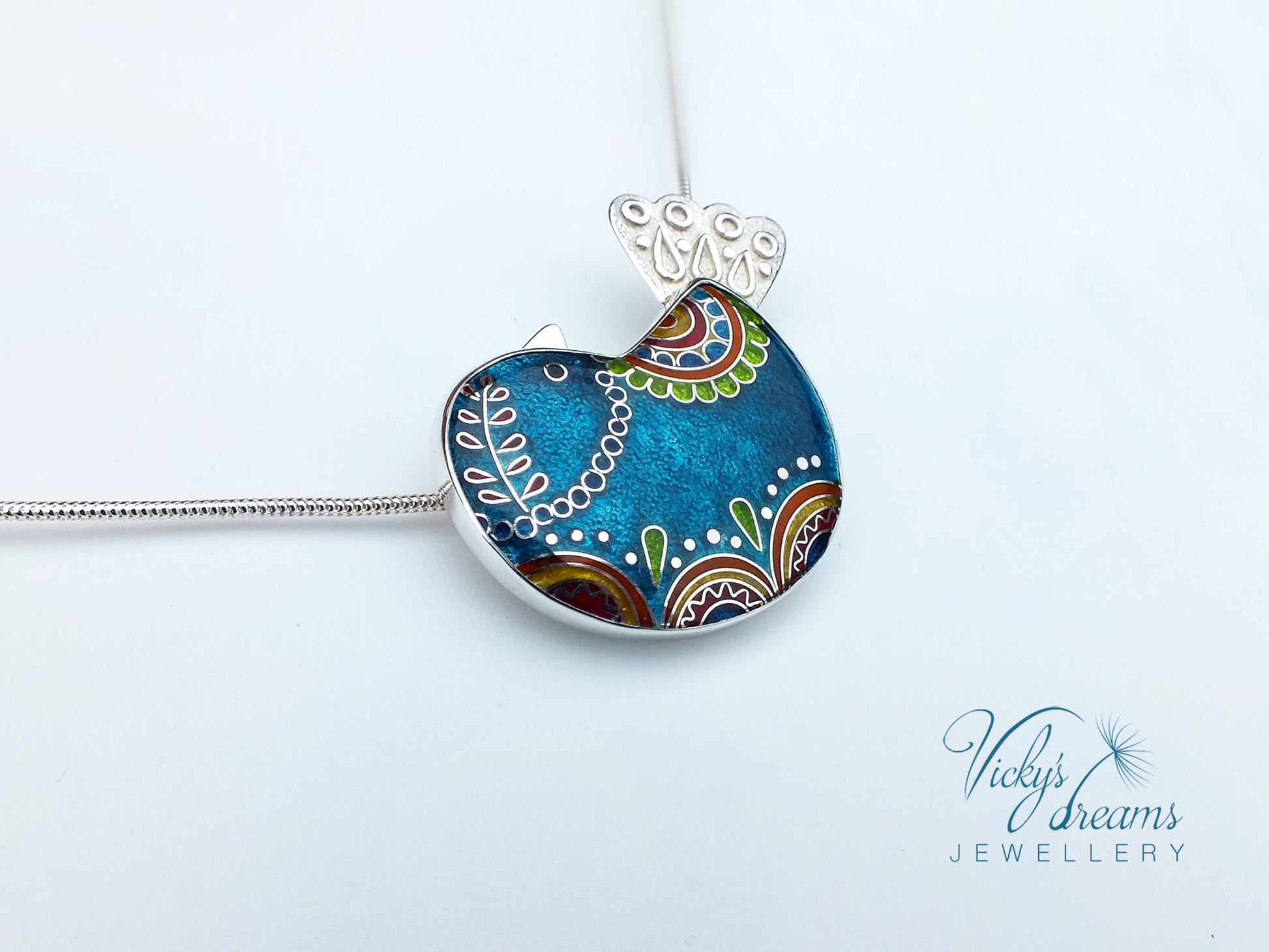 Cloisonné enamel necklace with vibrant color little bird design, set in sterling silver bezel.