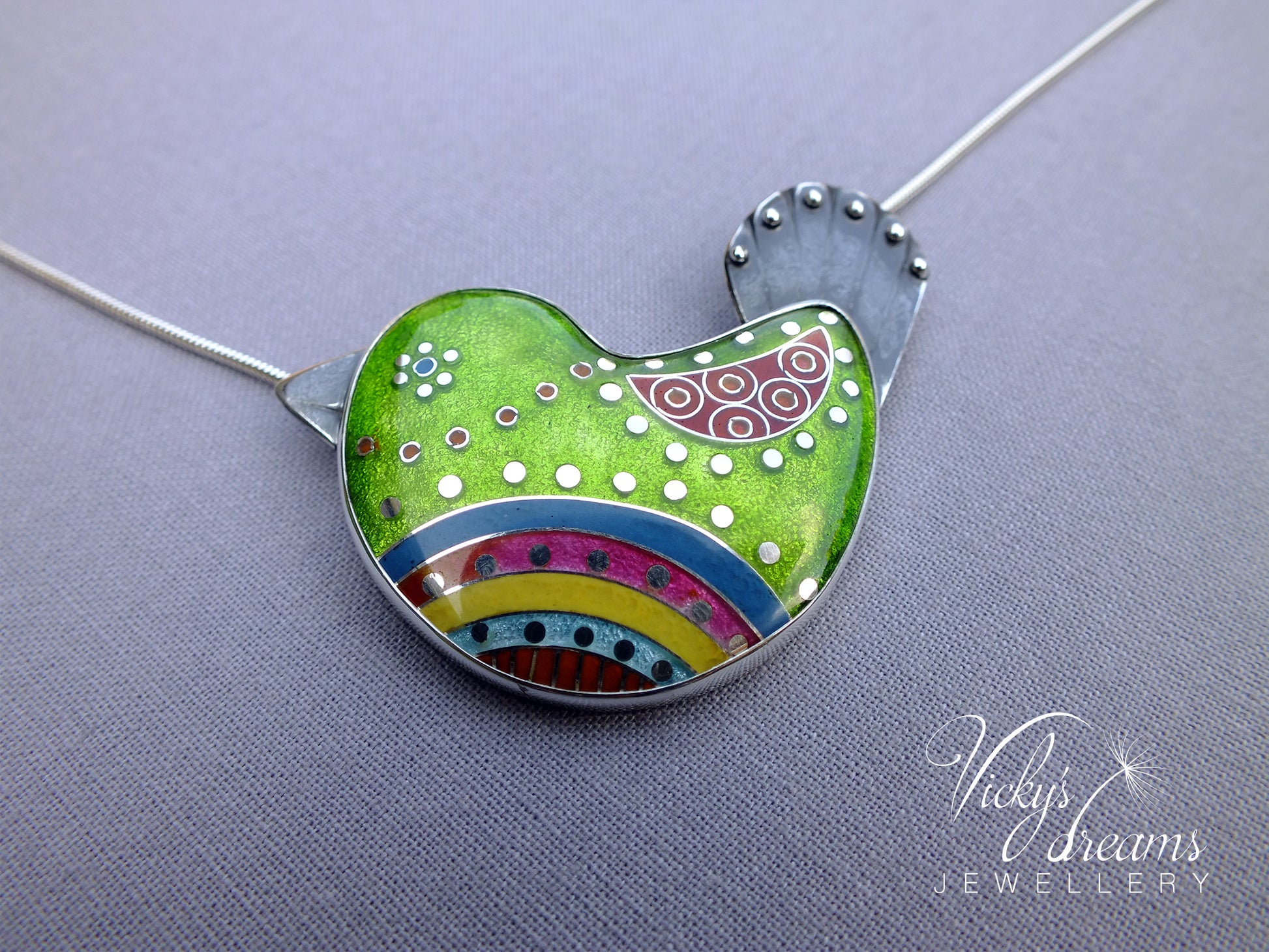 Cloisonné enamel necklace with vibrant color little bird design, set in sterling silver bezel.