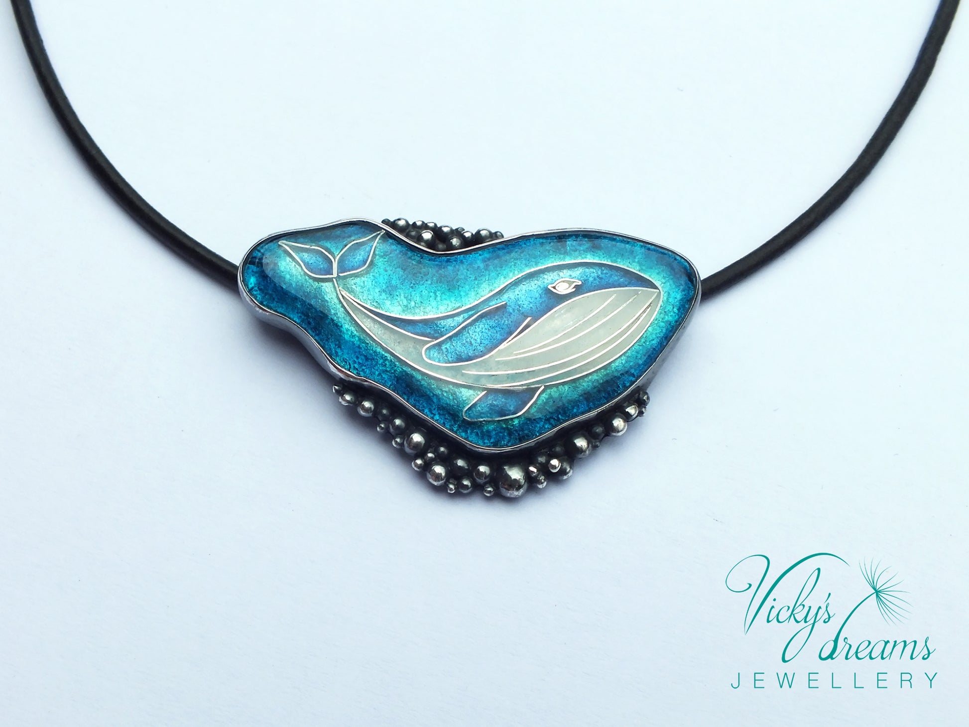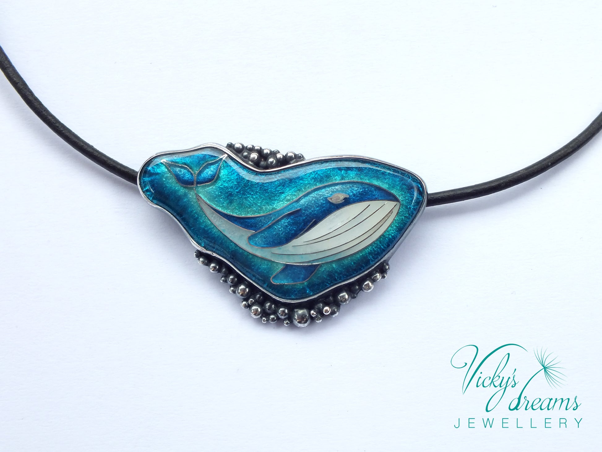 Handmade Cloisonné enamel necklace with Whale in sea foam design, set in silver bezel (oxidised to highlight the pattern).