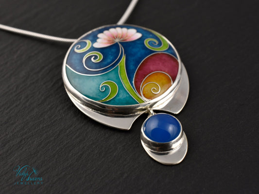 Boho flower Handmade Cloisonné Enamel Necklace – Vibrant Floral Design with Sterling Silver and Blue Agate