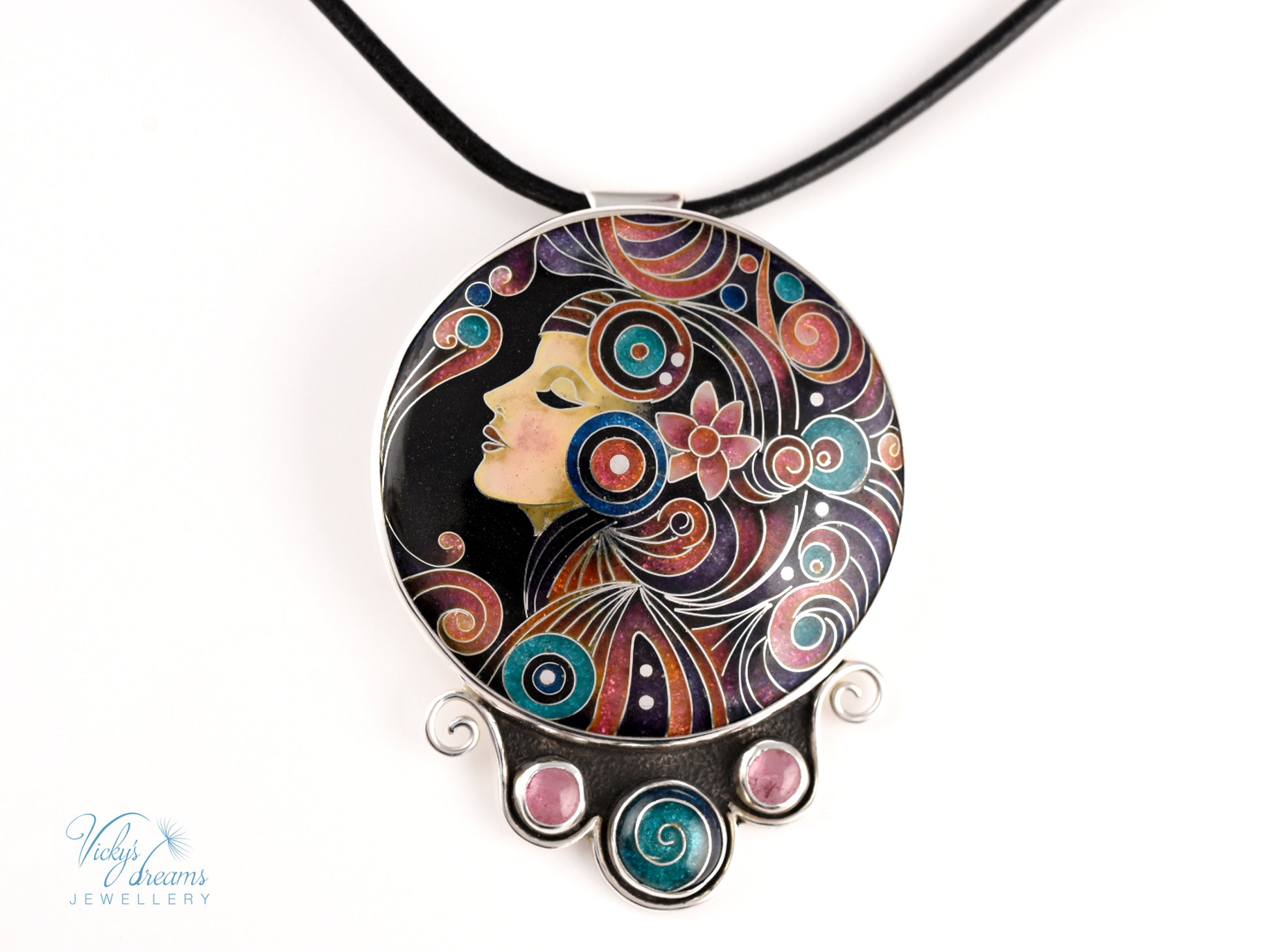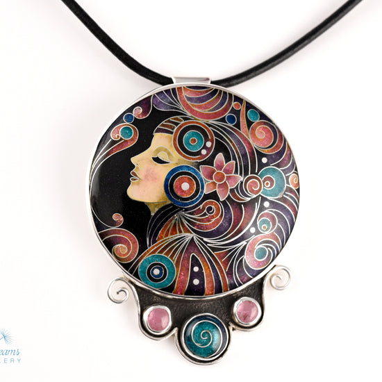 Discover the enchanting Artisan Cloisonné Necklace, a stunning piece that embodies artistry and elegance. Featuring the captivating Moon Dream design, this necklace showcases vibrant cloisonné enamel and natural tourmalines, all beautifully set in a sterling silver bezel.