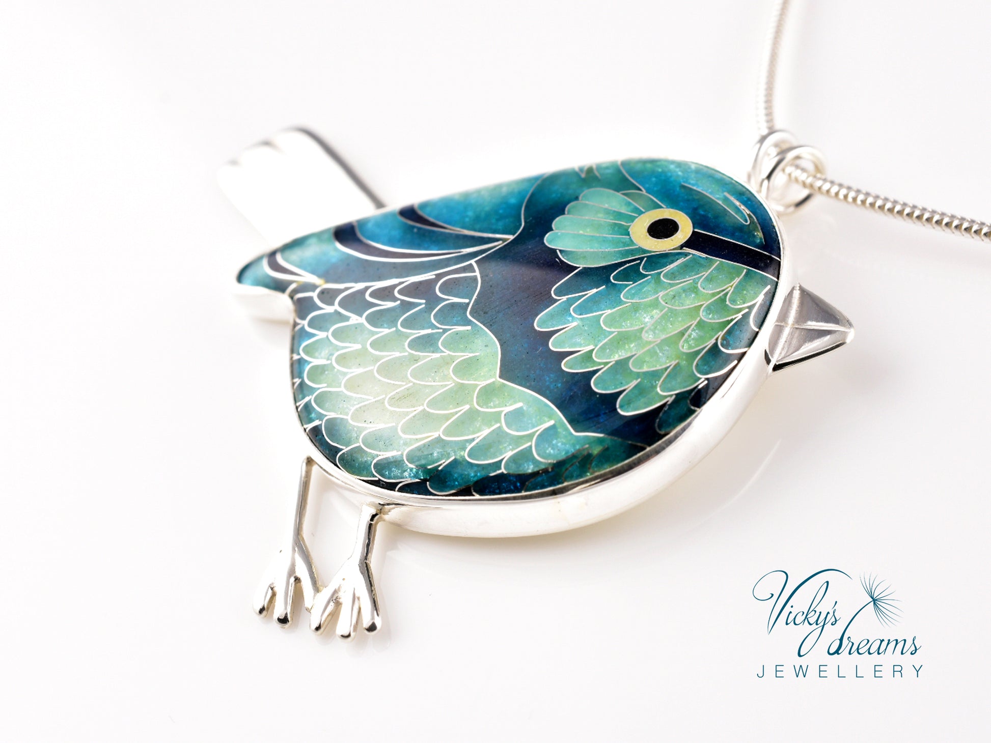 Cloisonné enamel necklace with vibrant blue birdie design, set in sterling silver bezel.