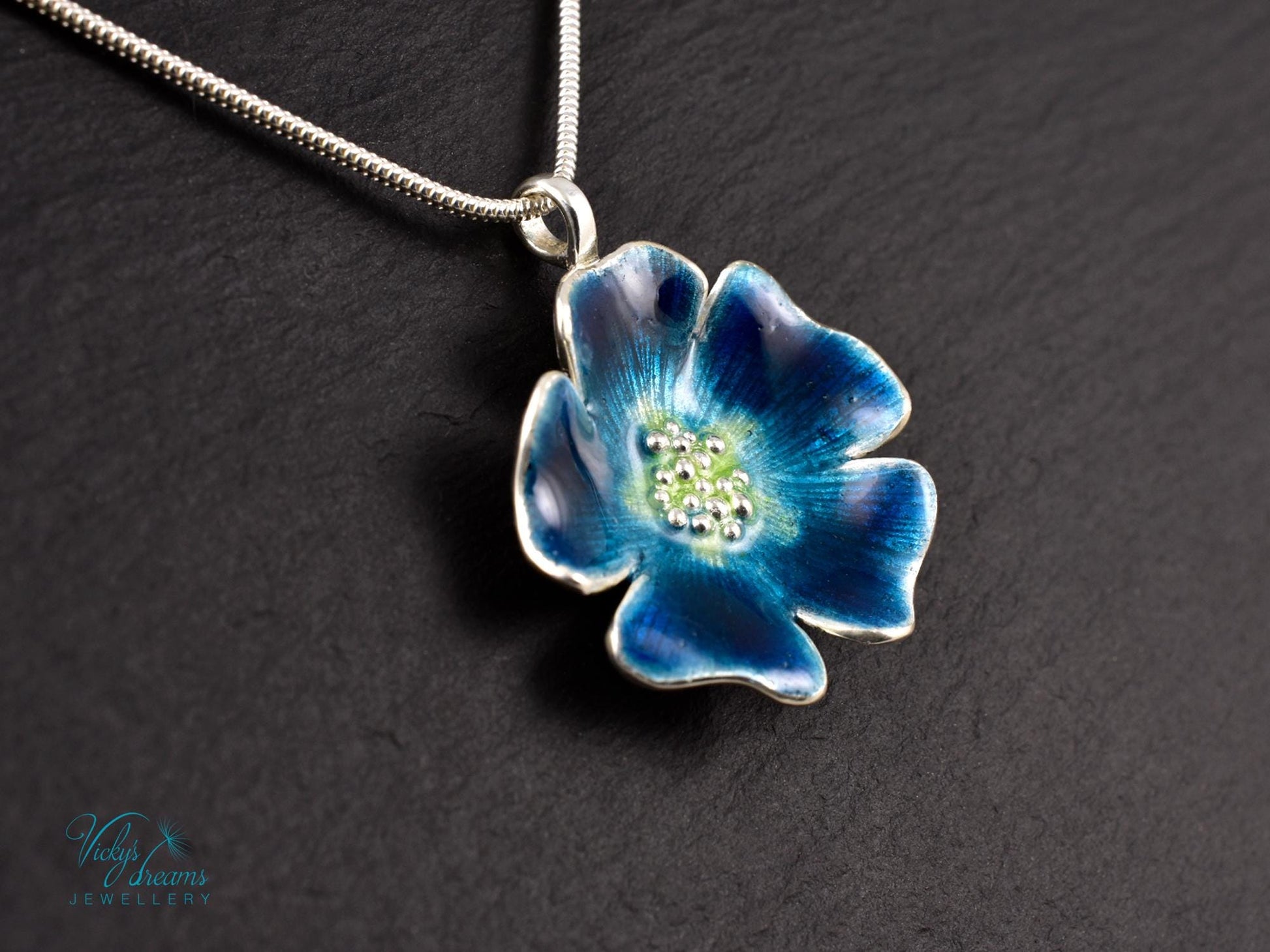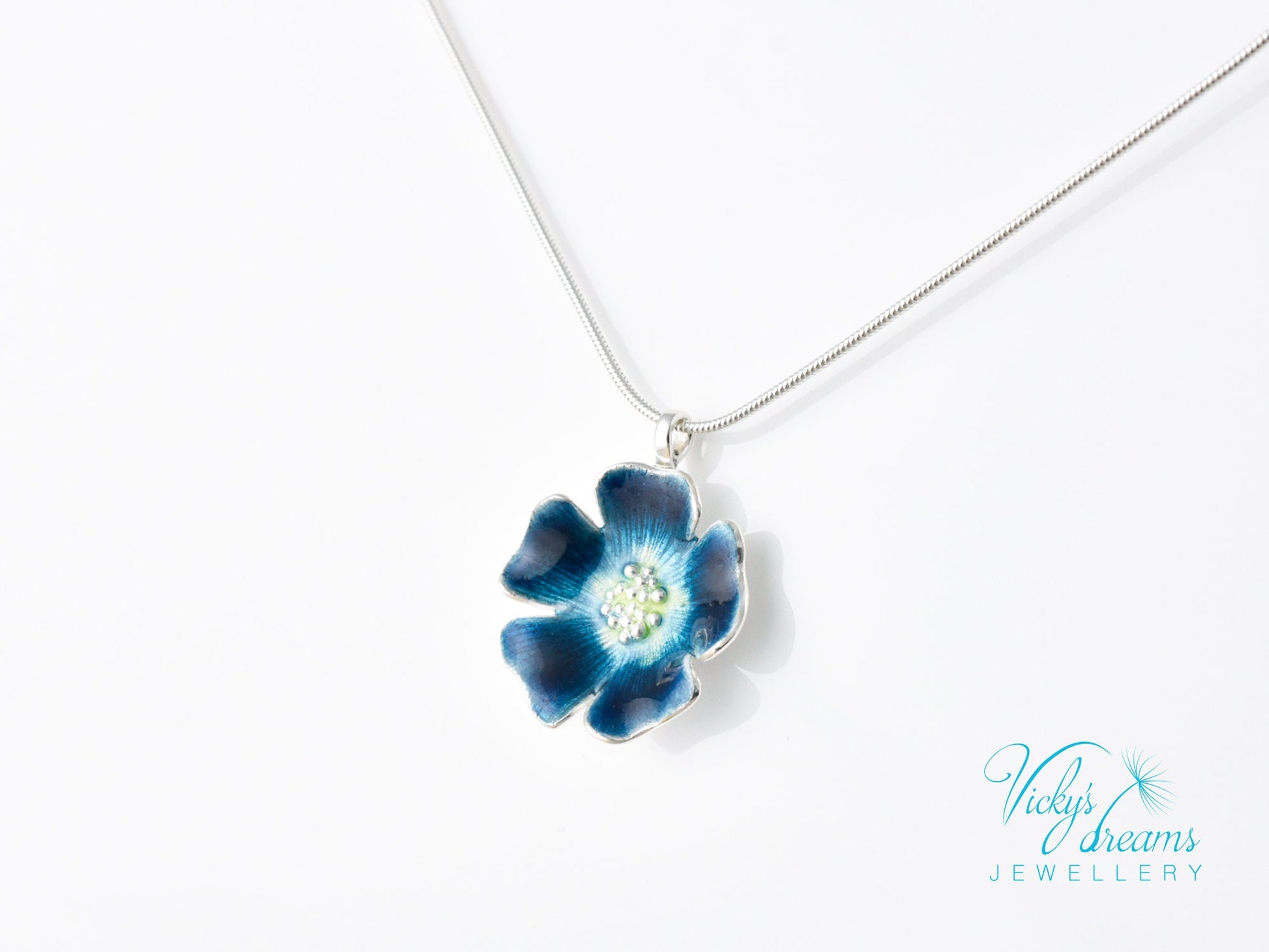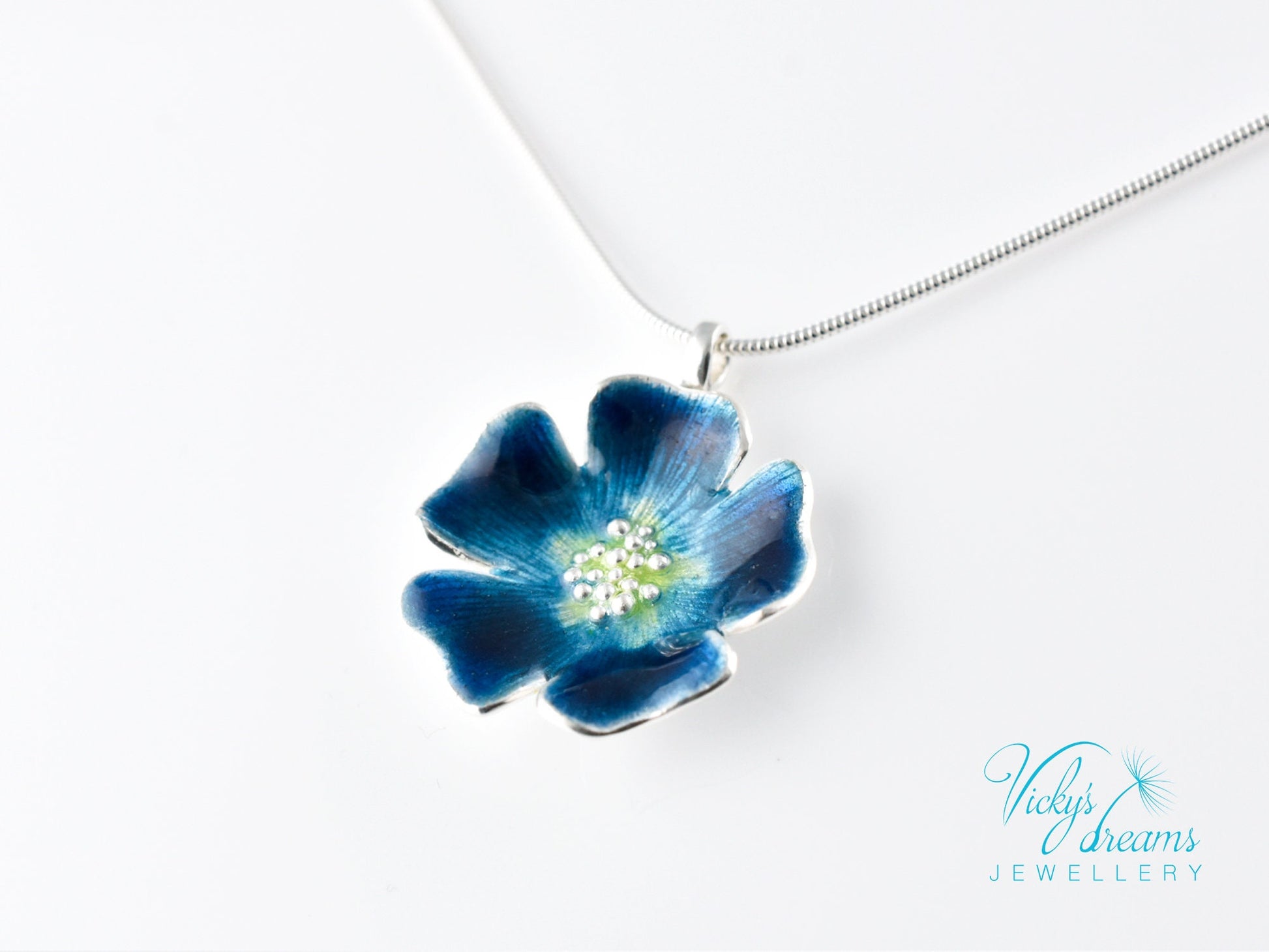 Handmade enamel necklace with vibrant blue flower design with fine silver. with sterling silver necklace.