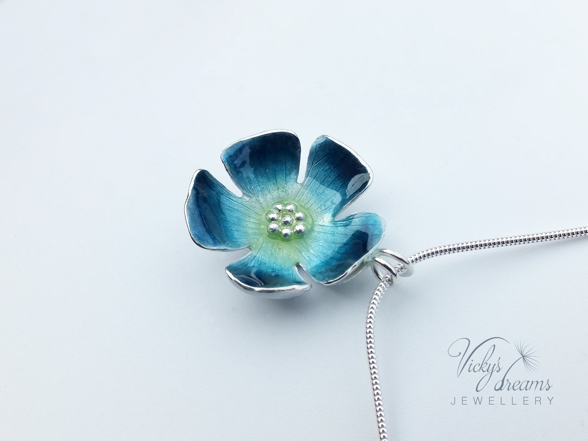 Handmade enamel necklace with vibrant blue flower design with fine silver. with sterling silver necklace.