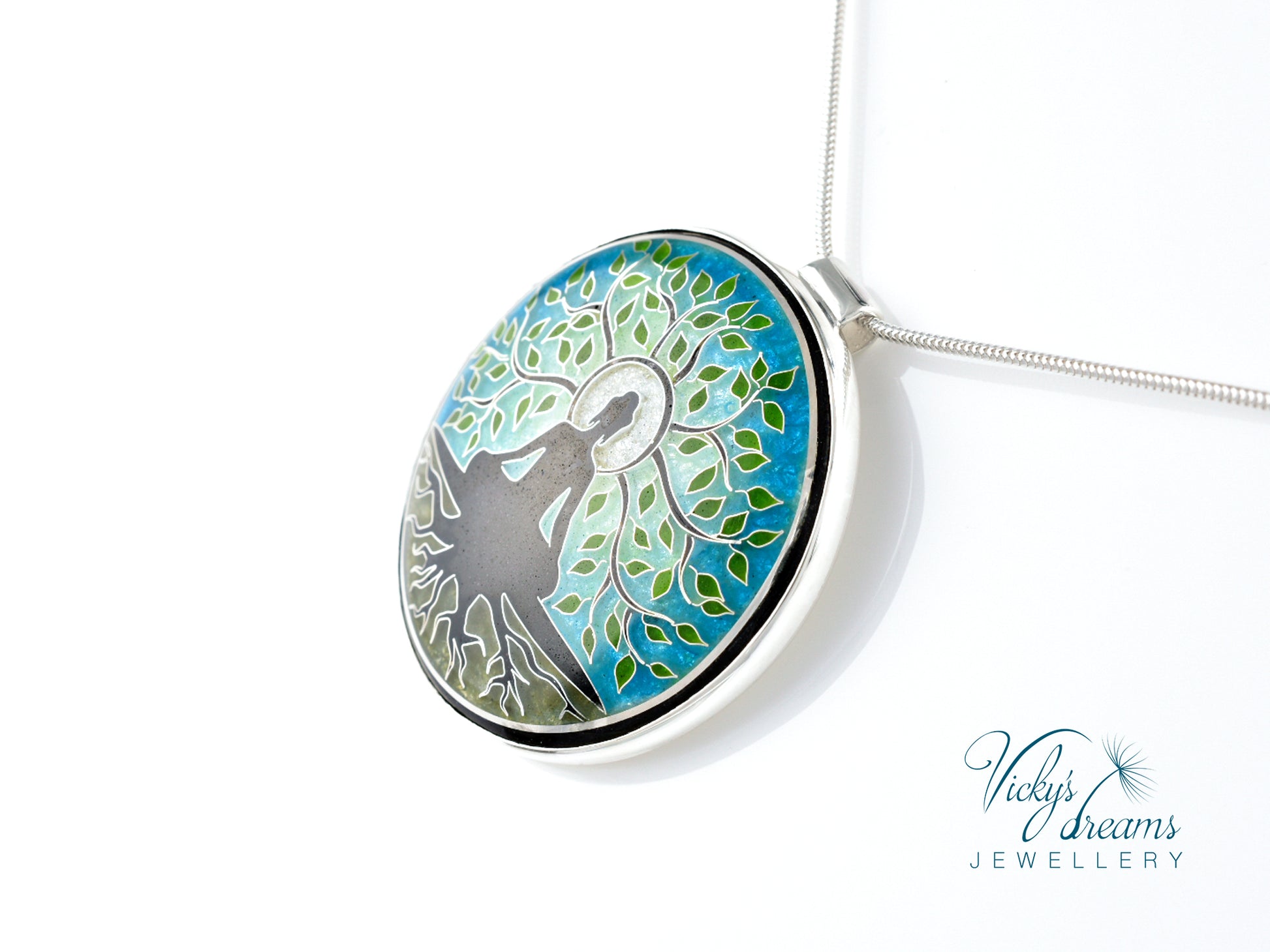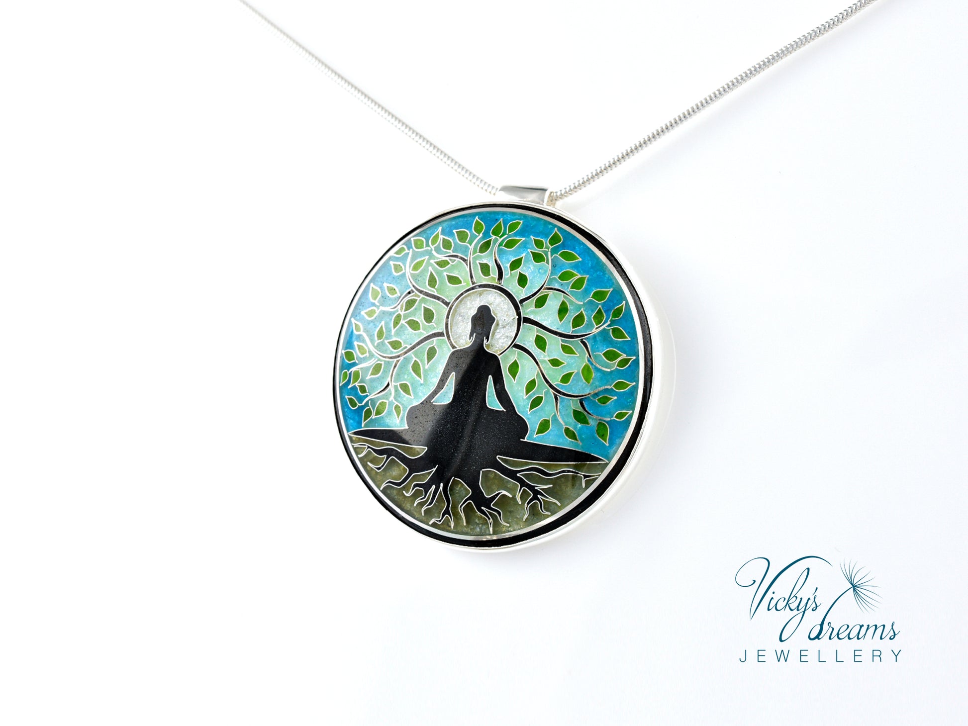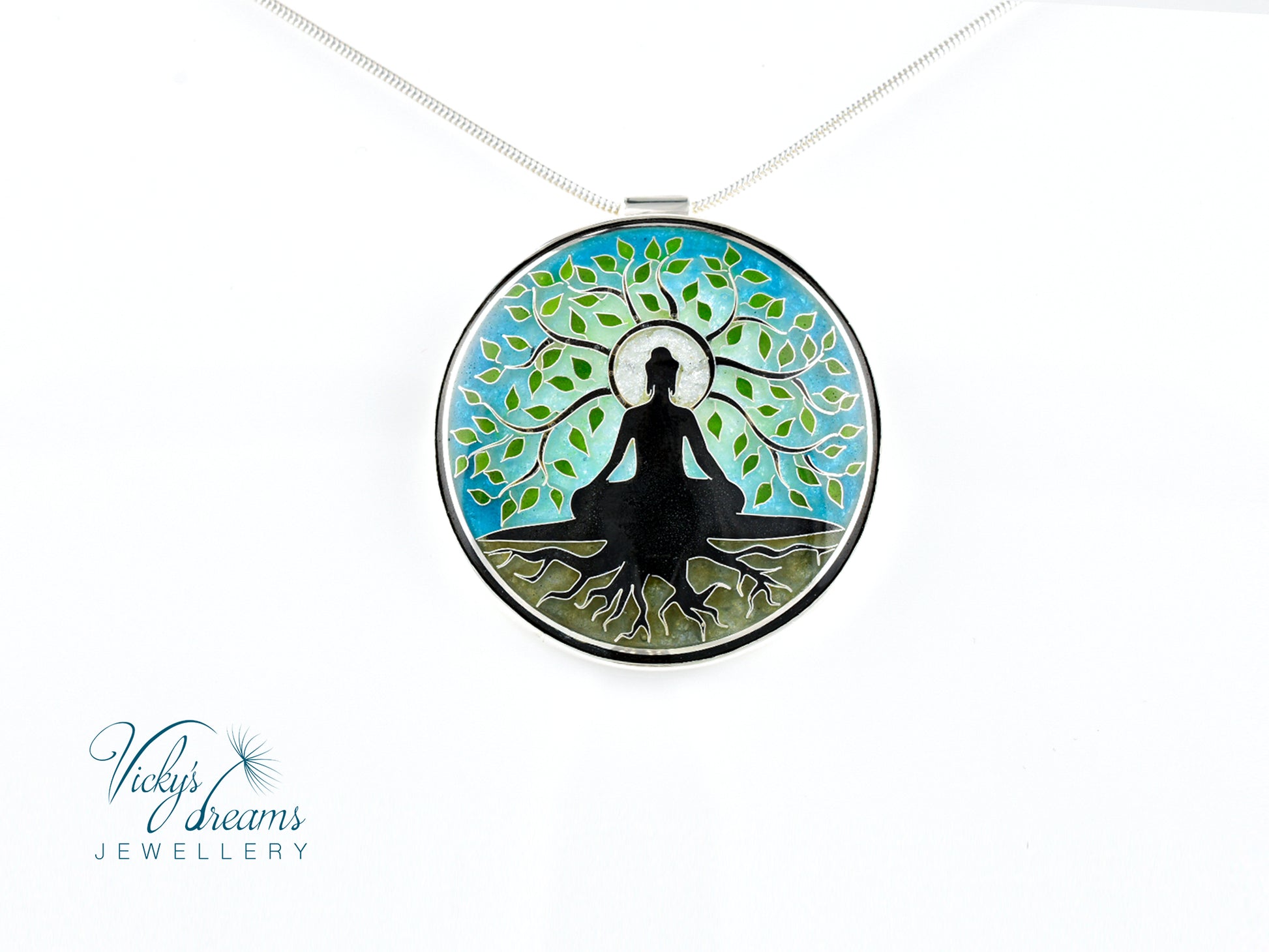 Cloisonné enamel necklace with vibrant blue Buddha tree design, set in sterling silver bezel.