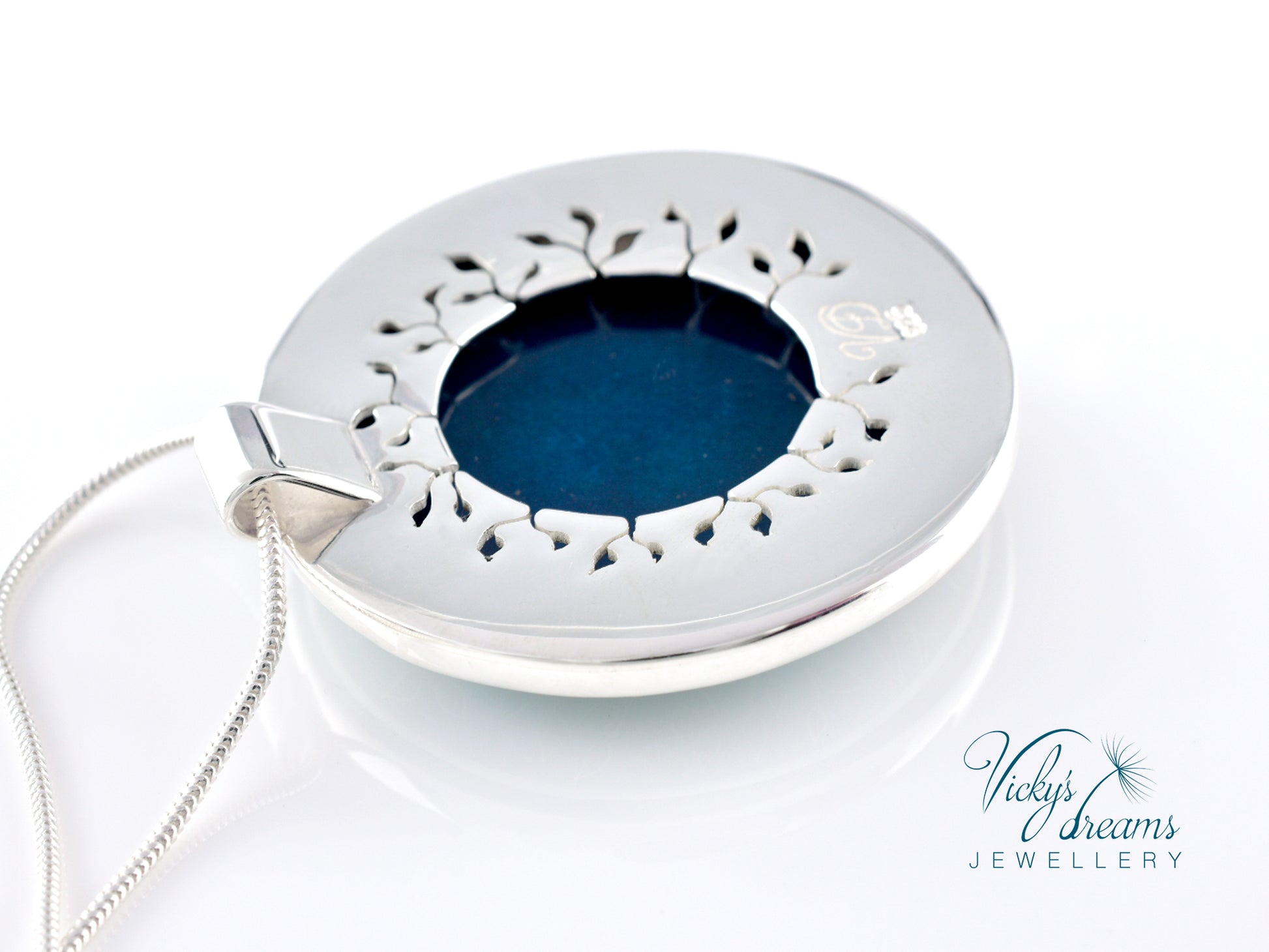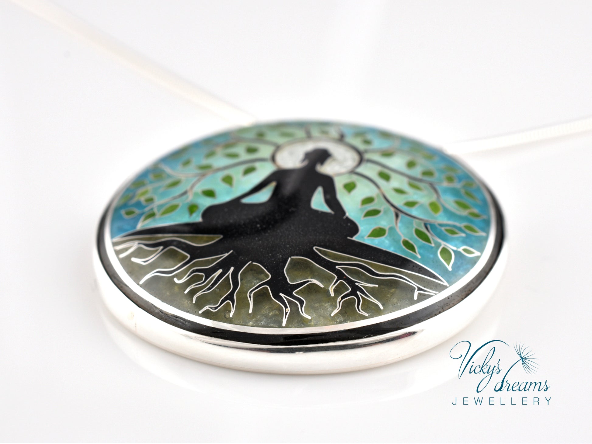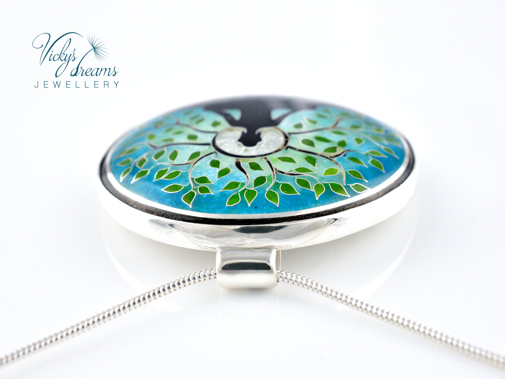 Cloisonné enamel necklace with vibrant blue Buddha tree design, set in sterling silver bezel.