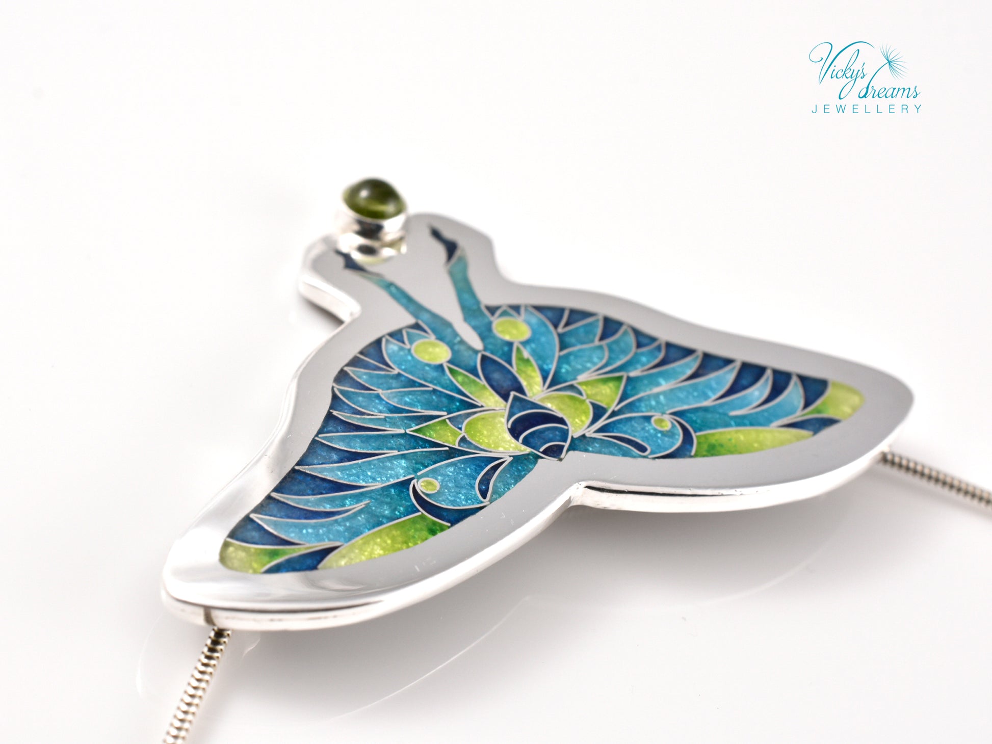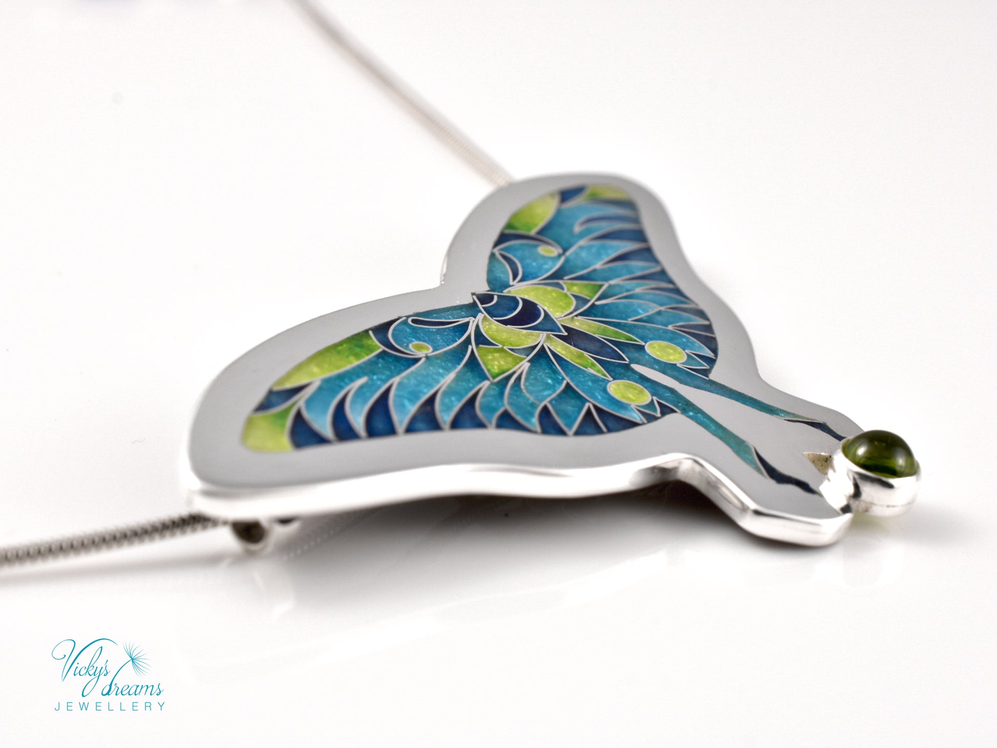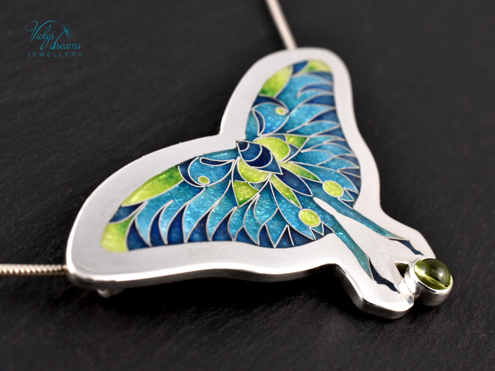 STUNNING Handcrafted Cloisonné & Champlevé Butterfly Pendant, gorgeous design with green/blue accents and peridot gemstone. This is high quality silver, reflecting the light. Another outstanding and eyecatching pendant from Vicky, thanks