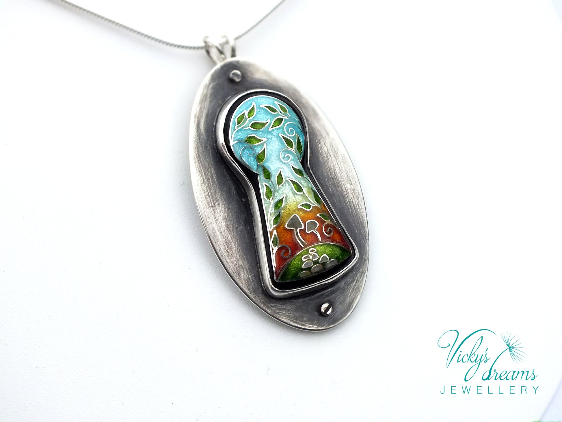 Handmade cloisonné enamel necklace with color Key hole design, set in sterling silver bezel (oxidised to highlight the pattern).