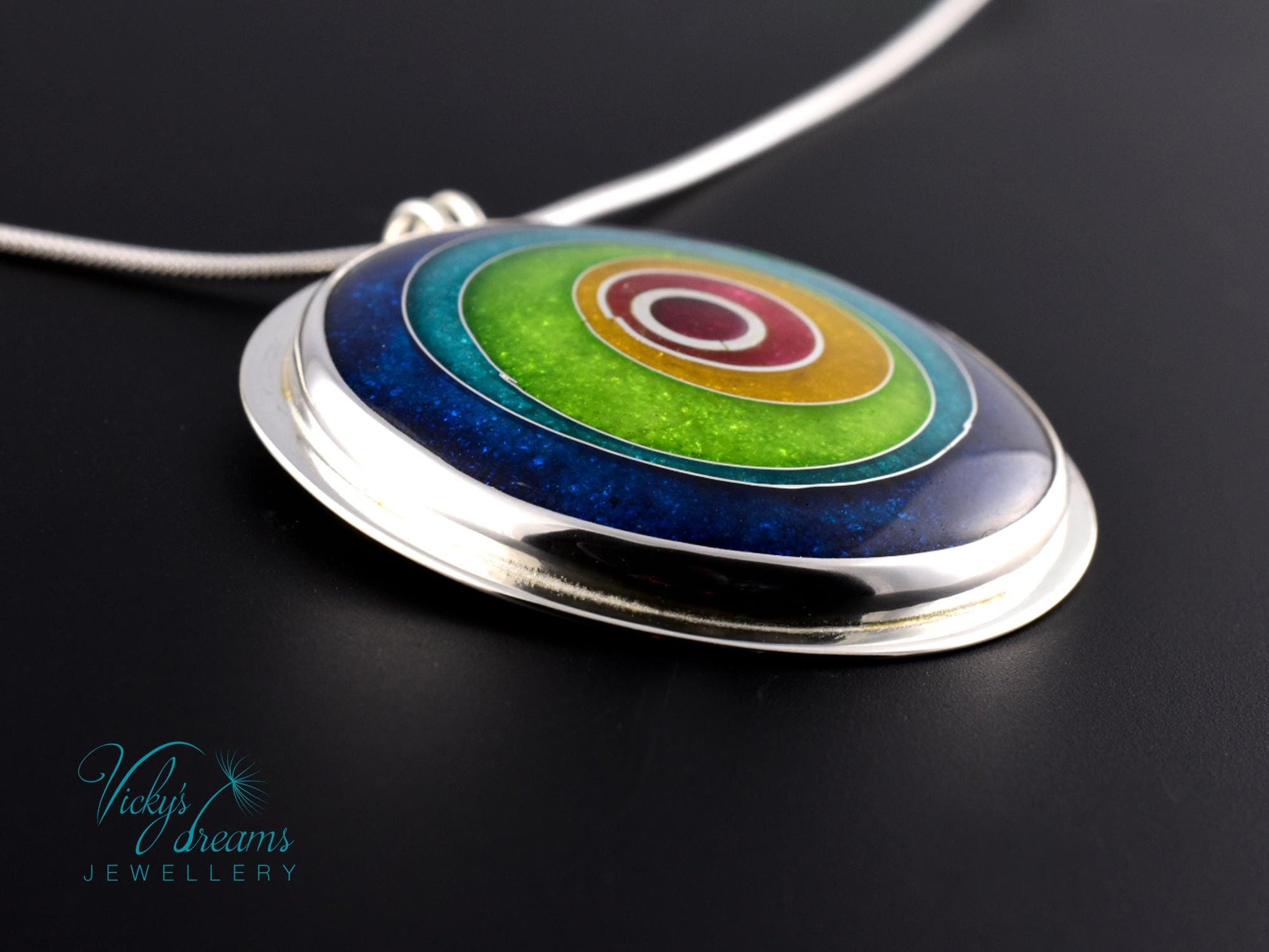 (The jewellery contains copper. Enamel is cured onto a layer of copper sheet with a silver lining and bezelled in sterling silver.)