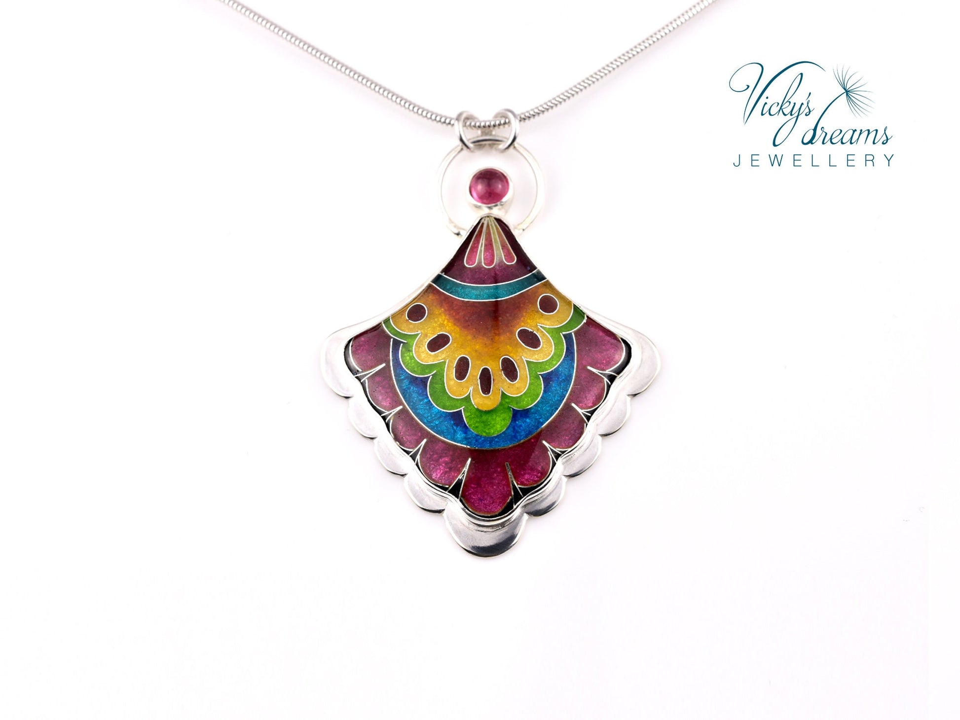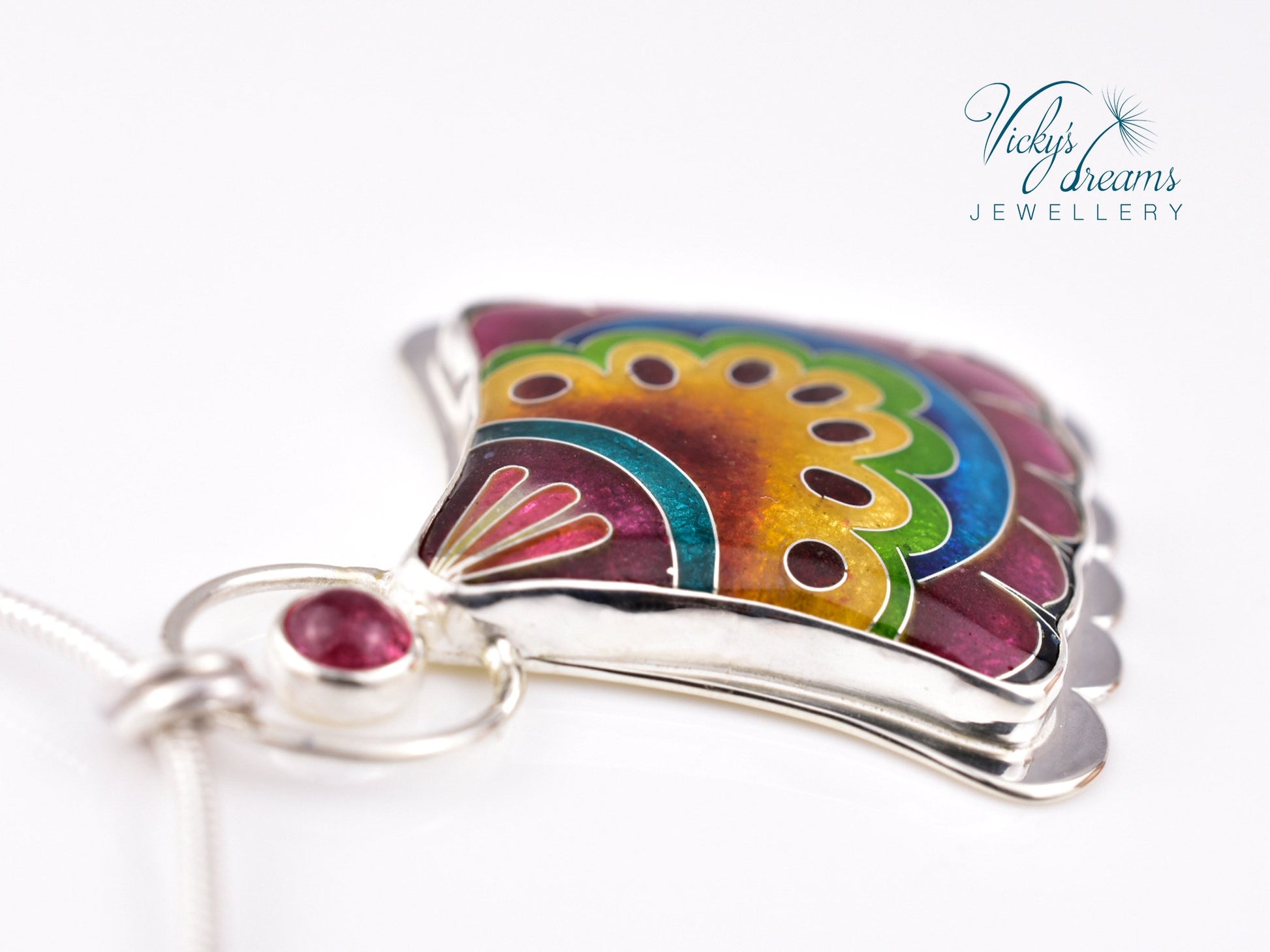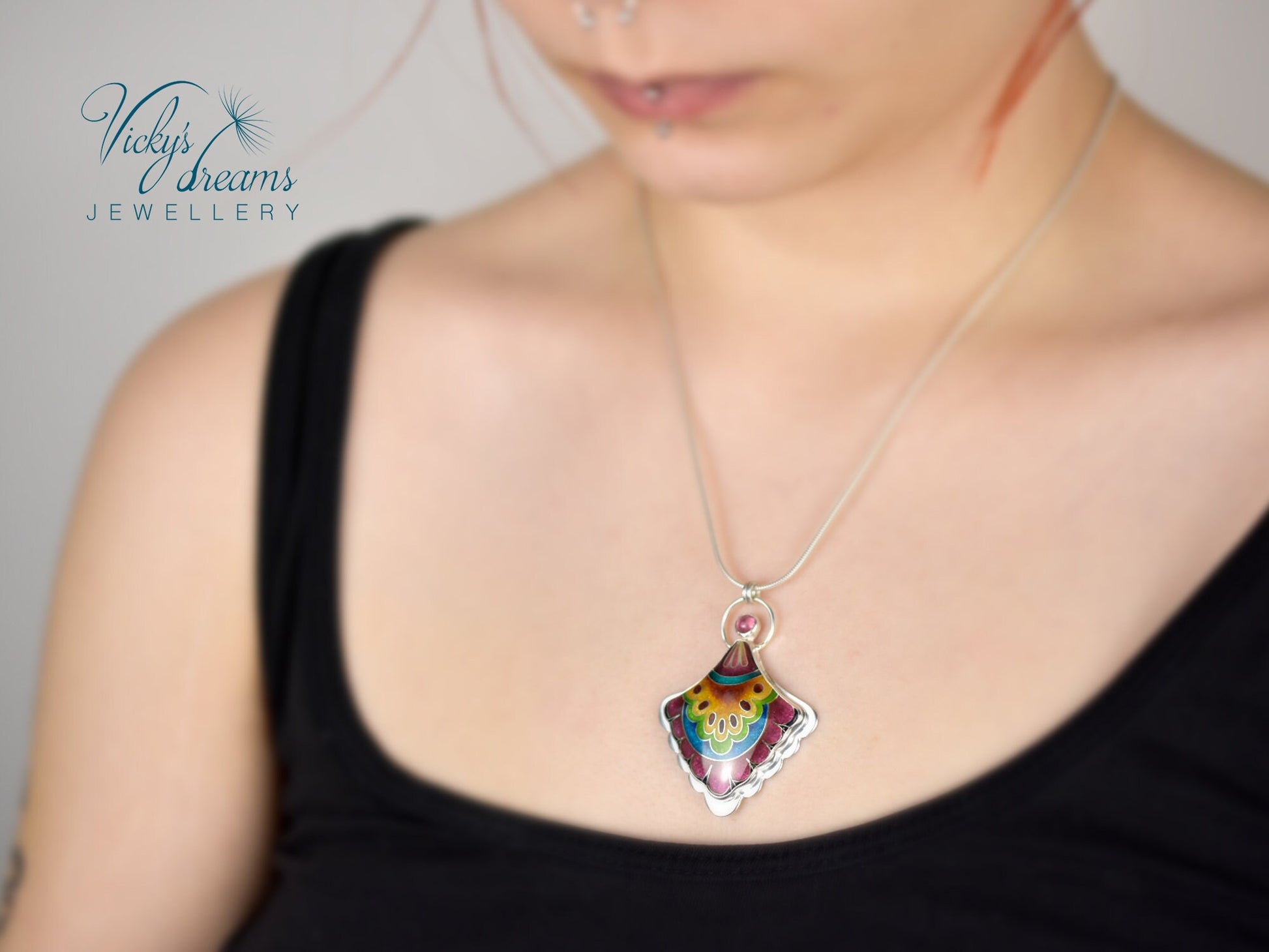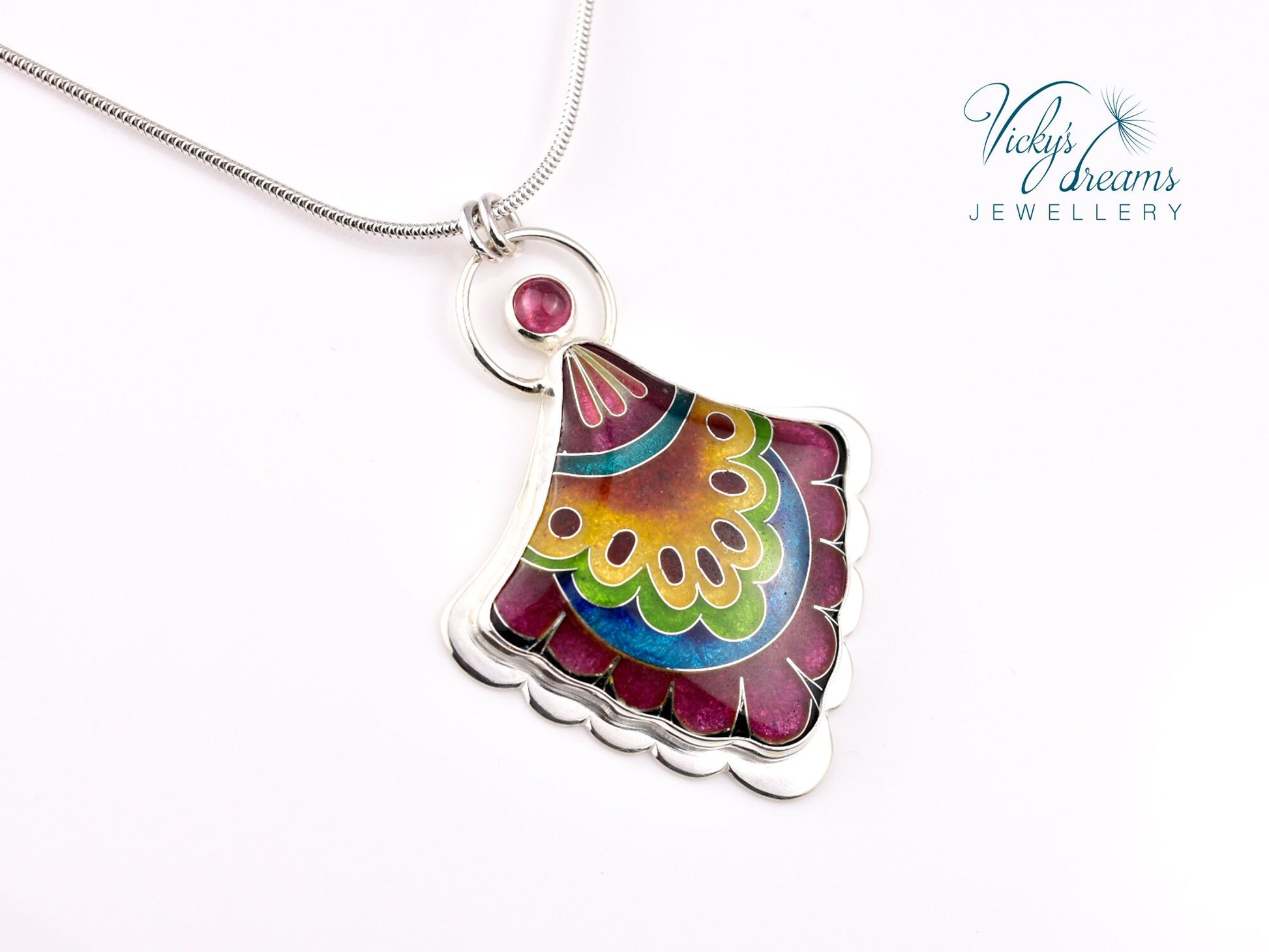 Fulcolor fan shaped design, sterling silver pendant, cloisonne enameled jewelry, handmade jewelry