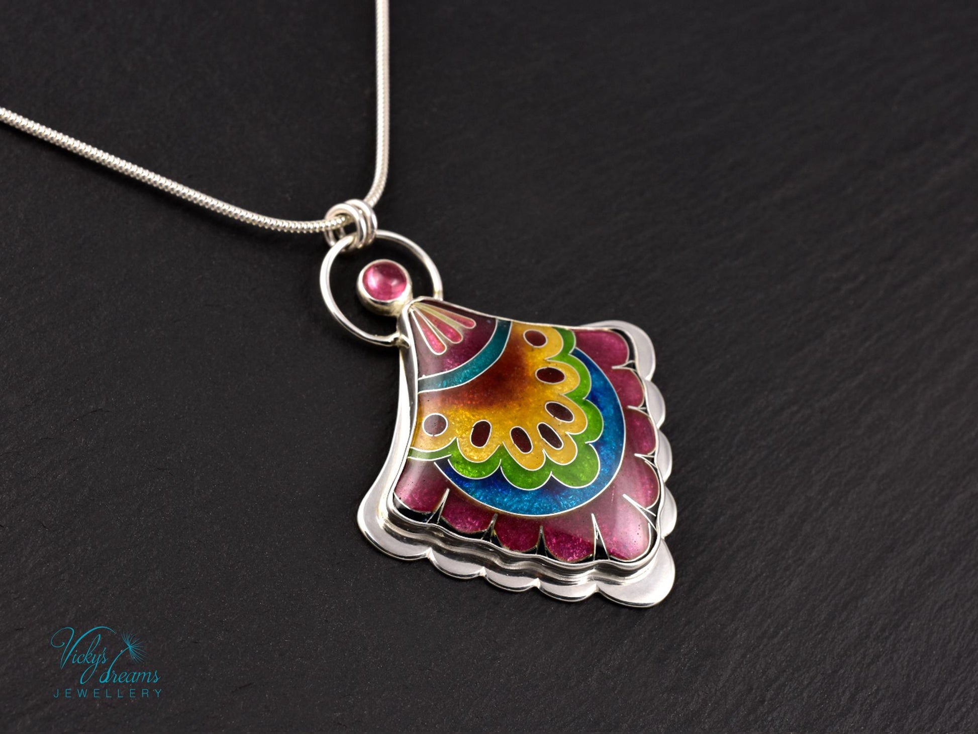 Cloisonné enamel necklace with vibrant Turquoise fan design, with pink Tourmaline natural stone. Set in sterling silver bezel.
