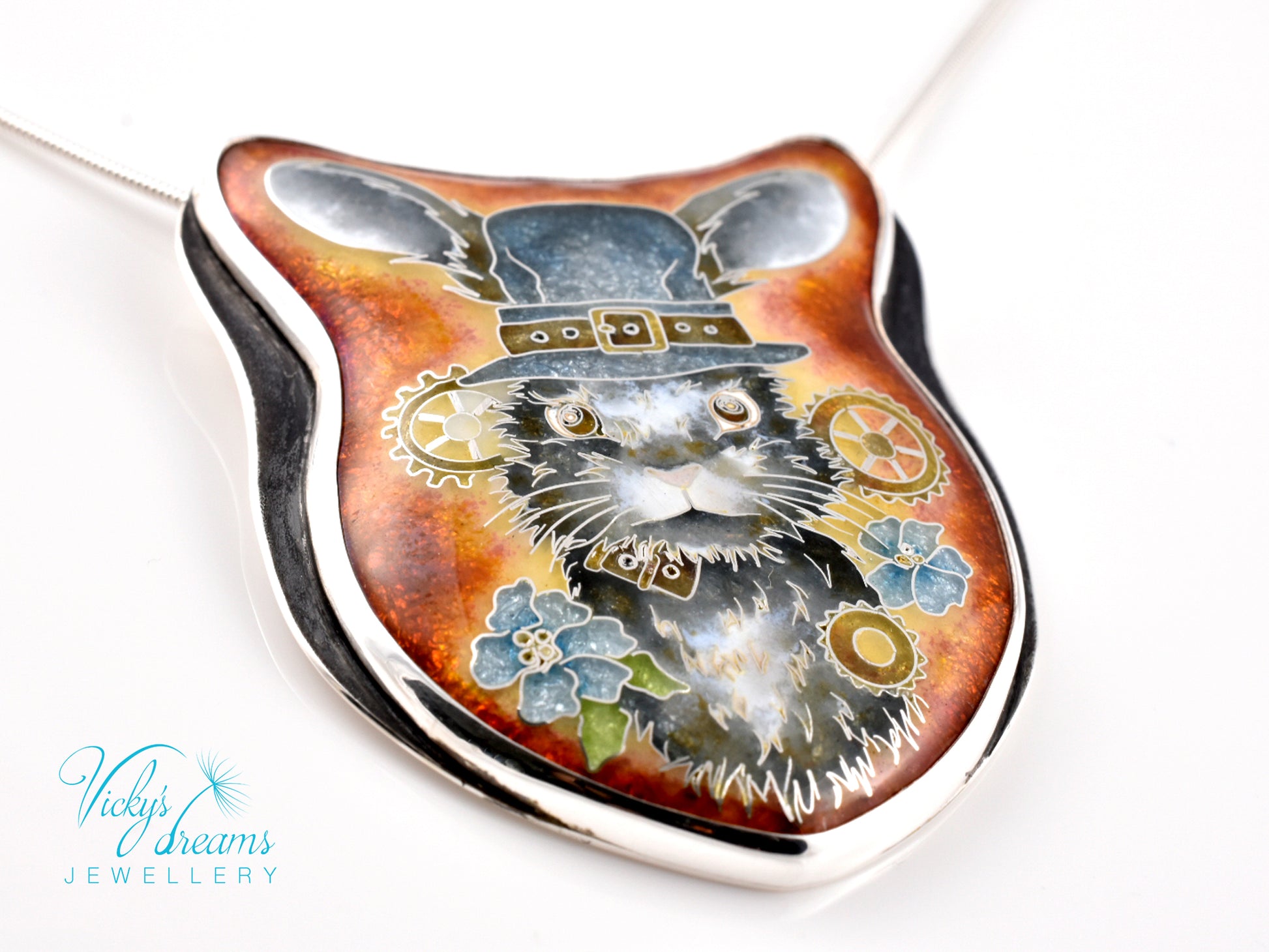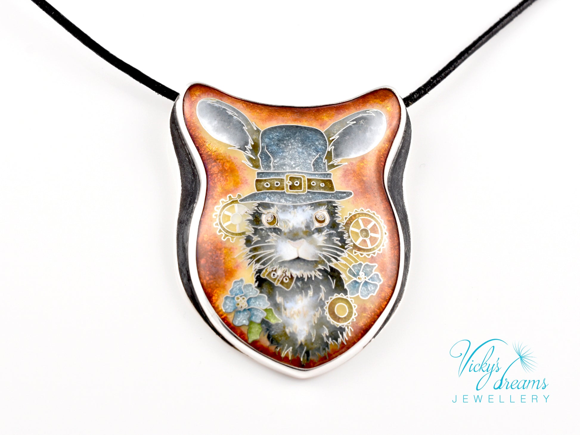 Handmade Cloisonné enamel necklace with bunny design, set in sterling silver bezel (oxidised to highlight the pattern).