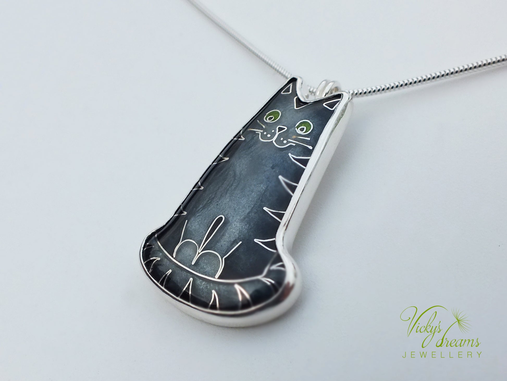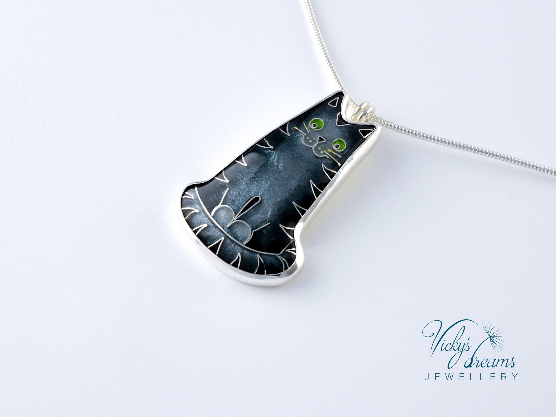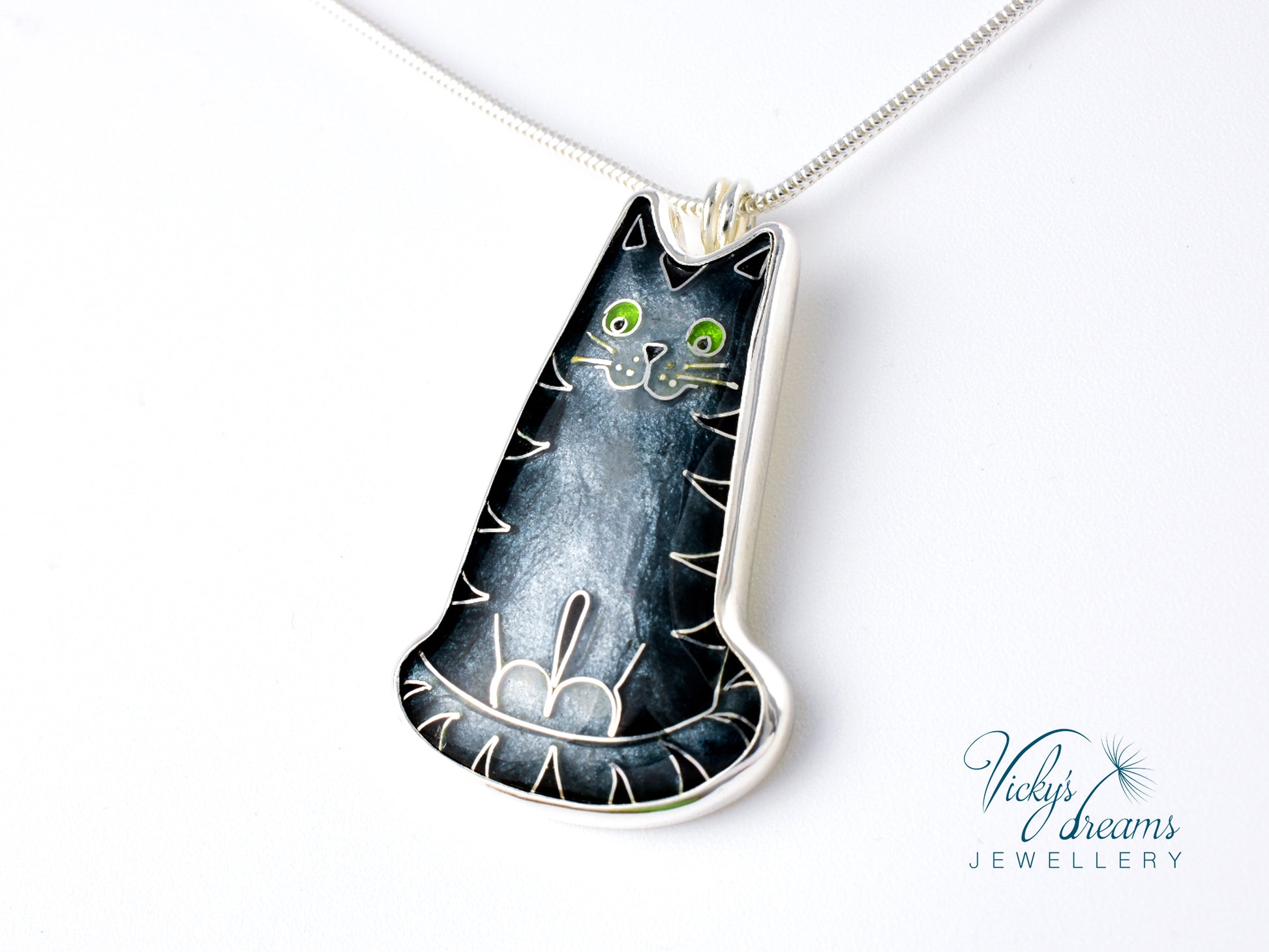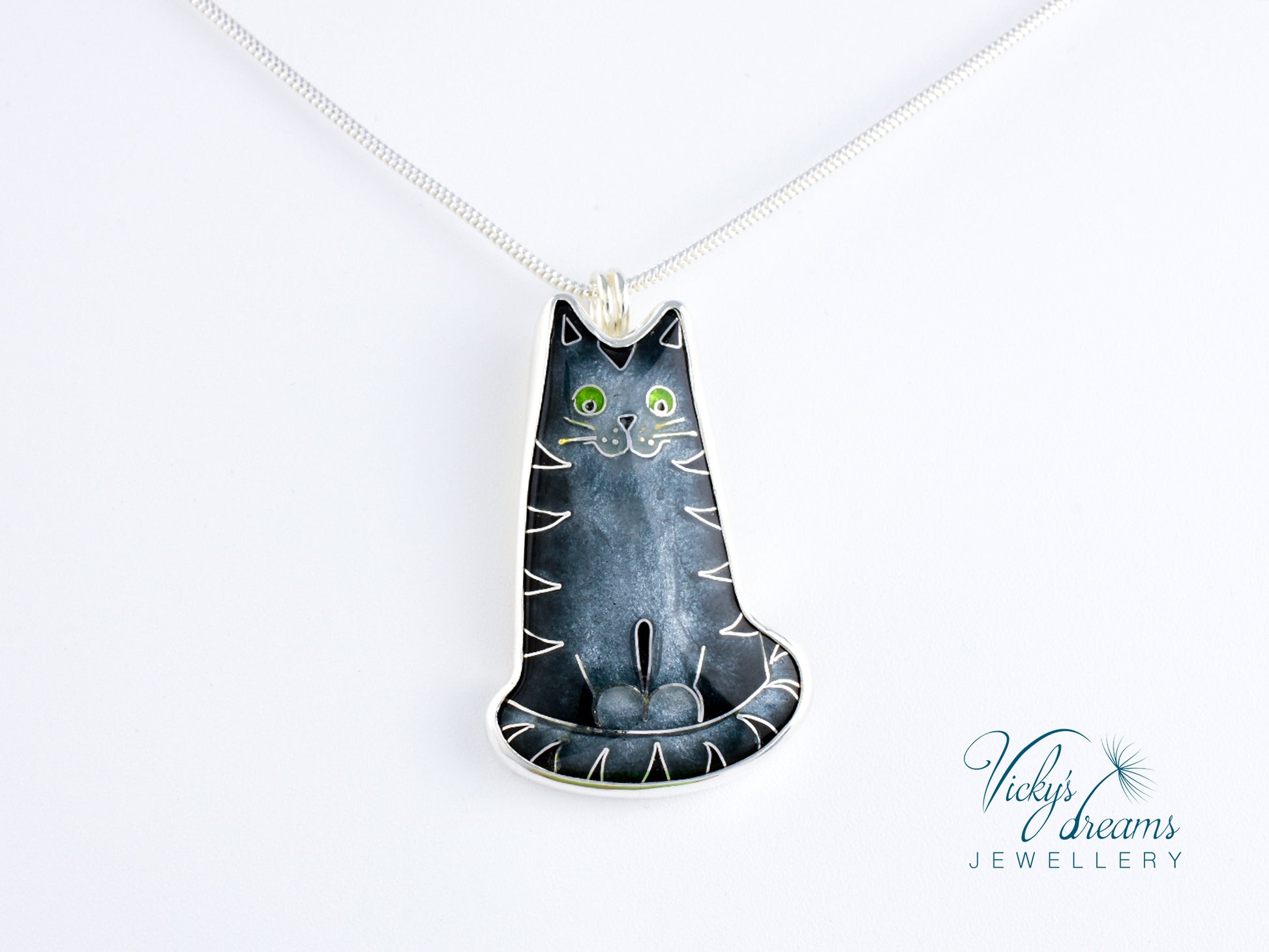 Made with love this beautiful, handmade cloisonné enamel gray cat design pendant, set in sterling silver bezel, with sterling silver necklace.Perfect for any cat lovers as a gift, or just treat yourself with it.