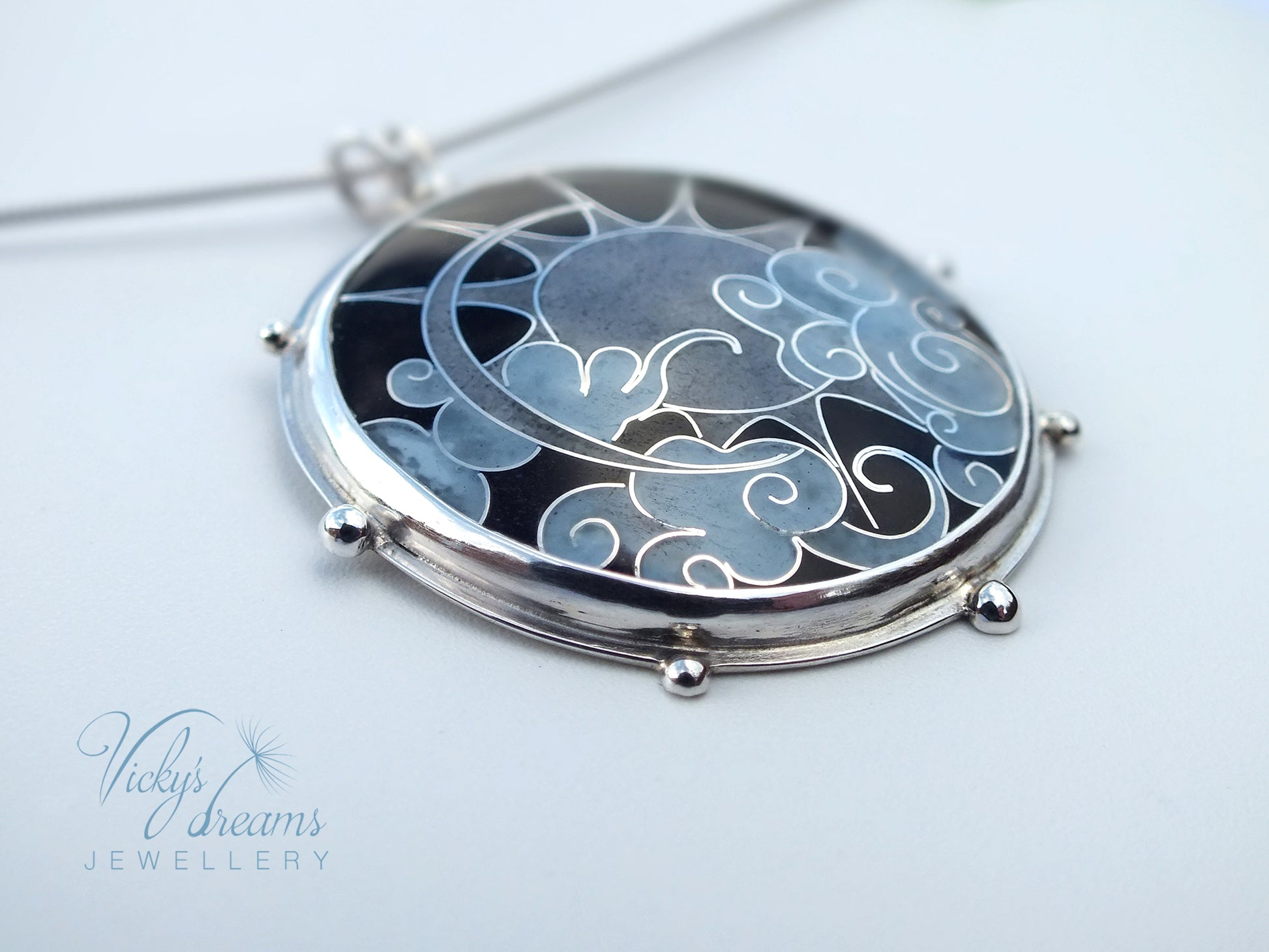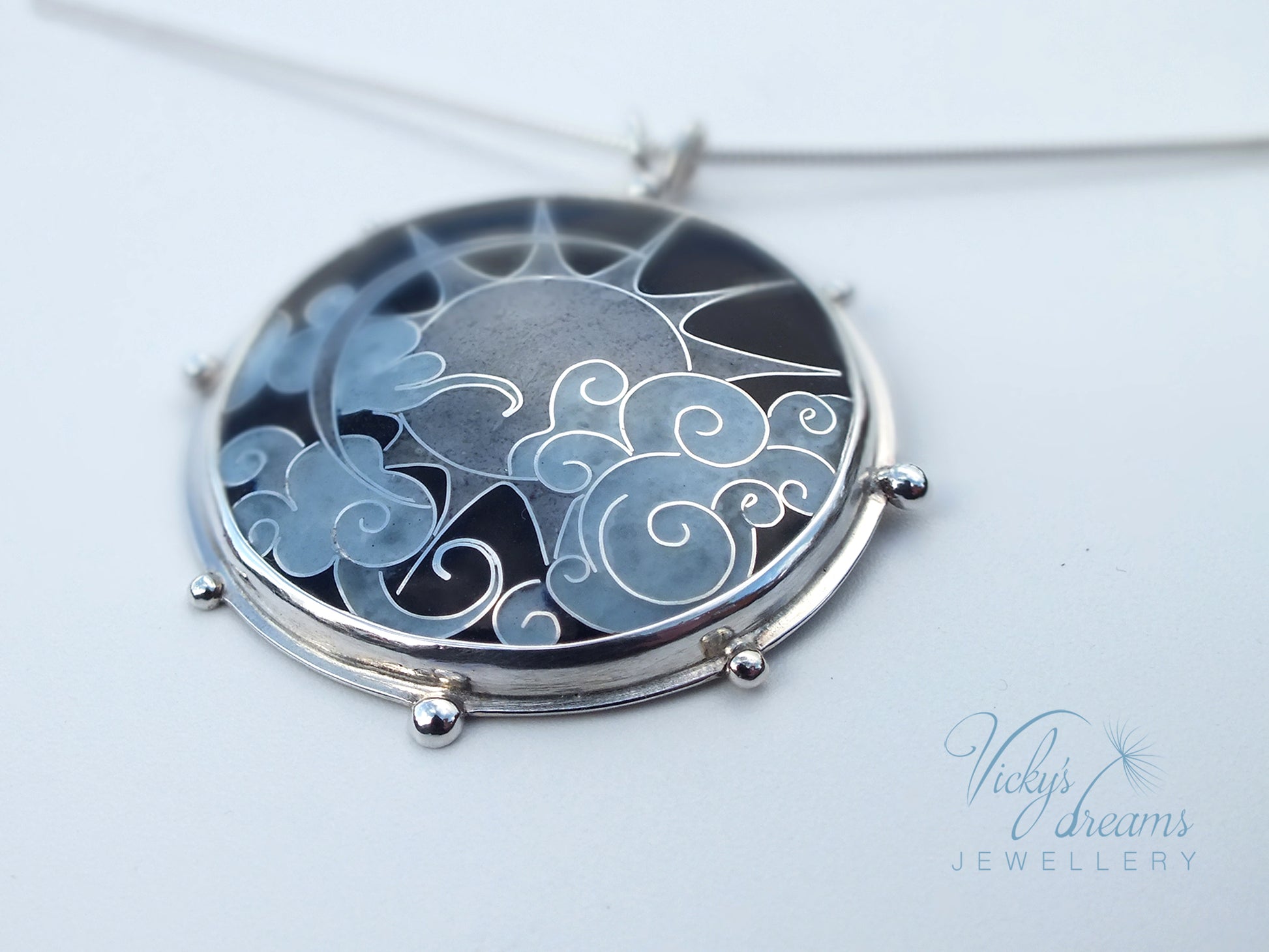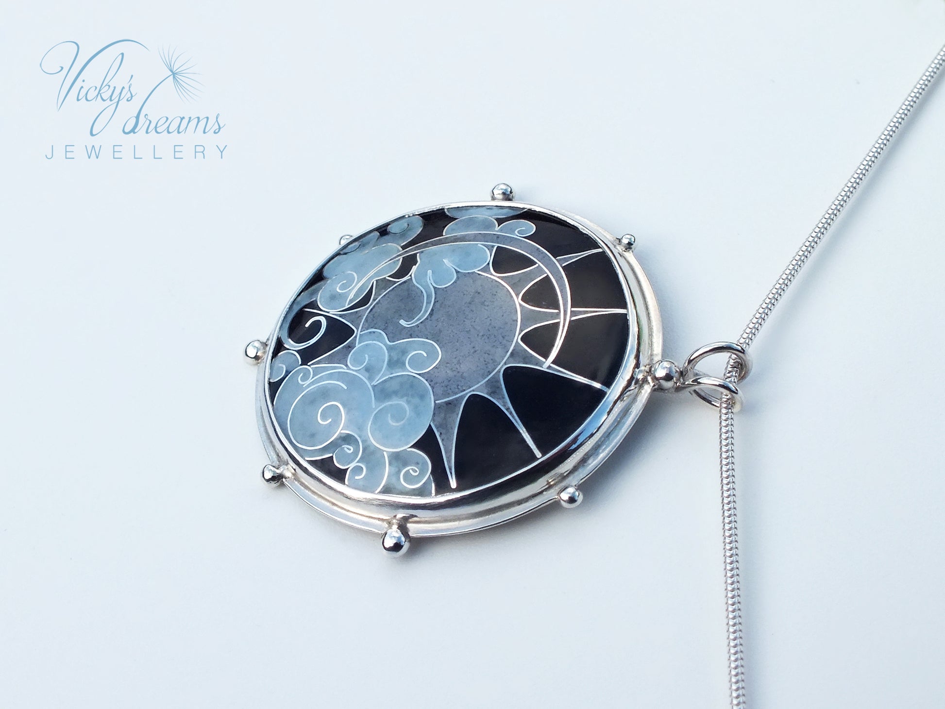Cloisonné enamel necklace with Grayscale Sun & Clouds design, set in sterling silver bezel.