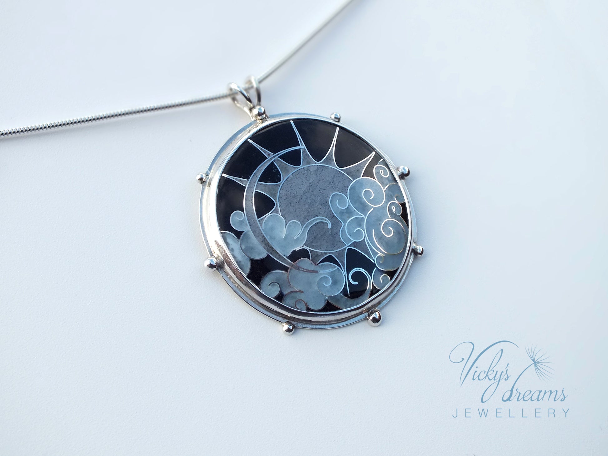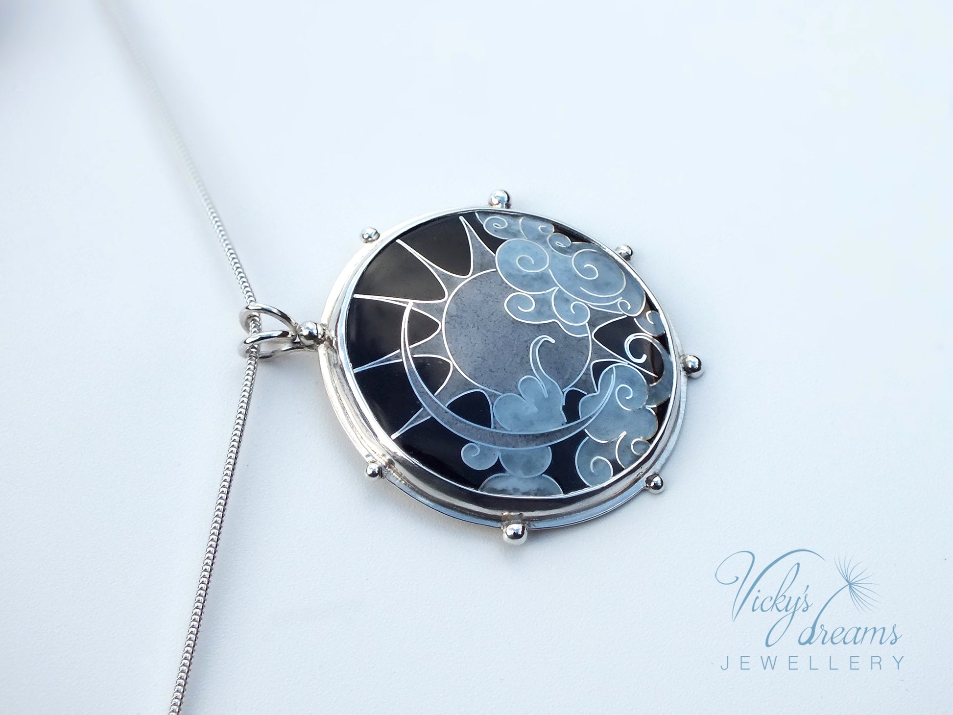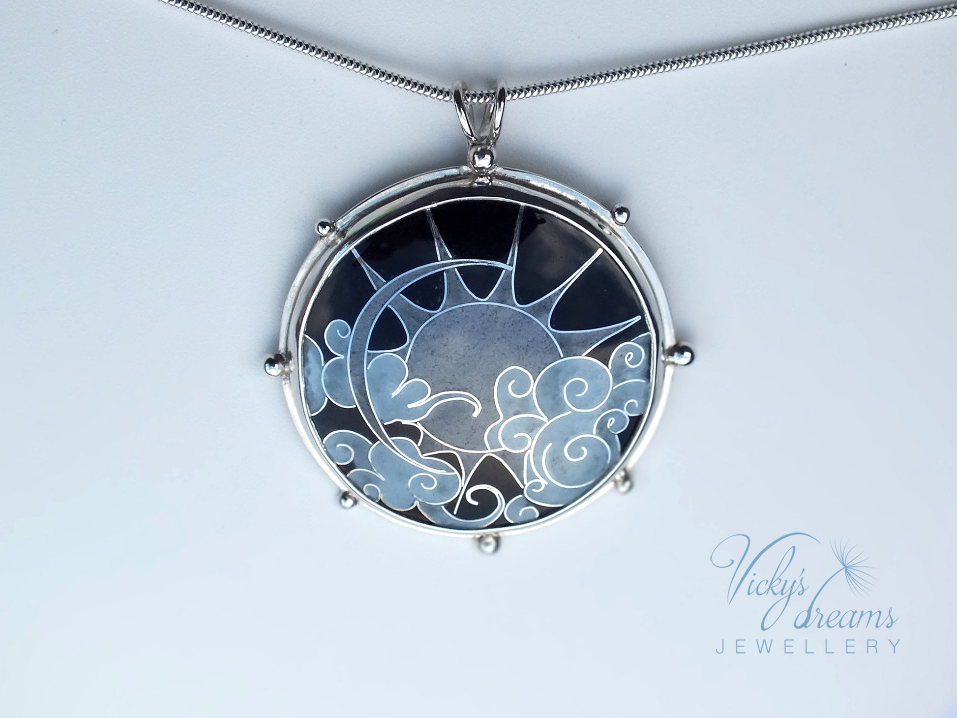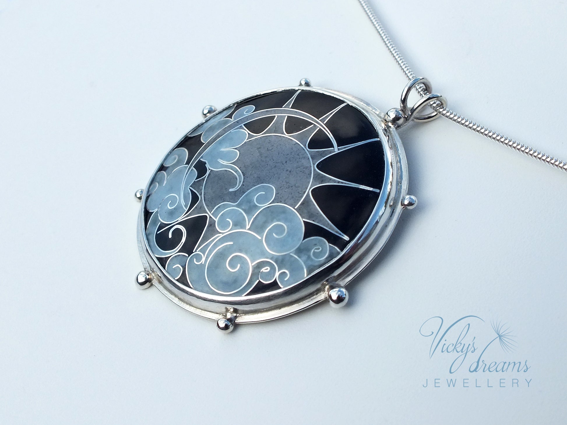 Cloisonné enamel necklace with Grayscale Sun & Clouds design, set in sterling silver bezel.