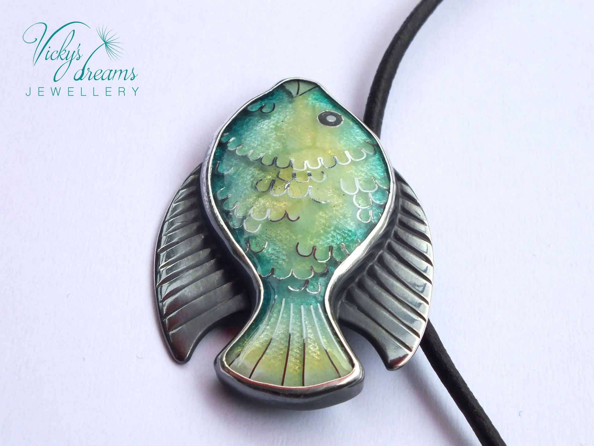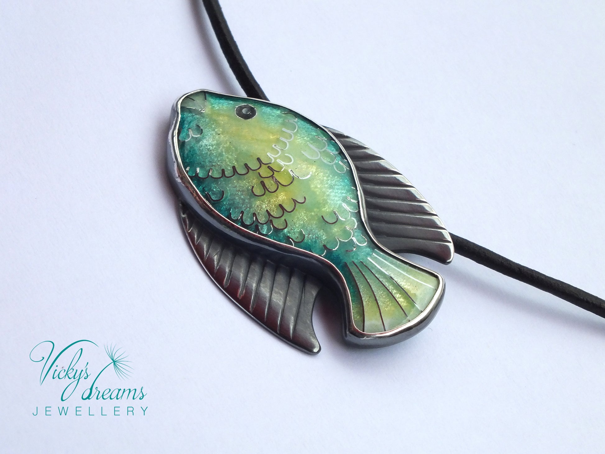 Handmade Cloisonné enamel necklace with Fish design, set in sterling silver bezel (oxidised to highlight the pattern).