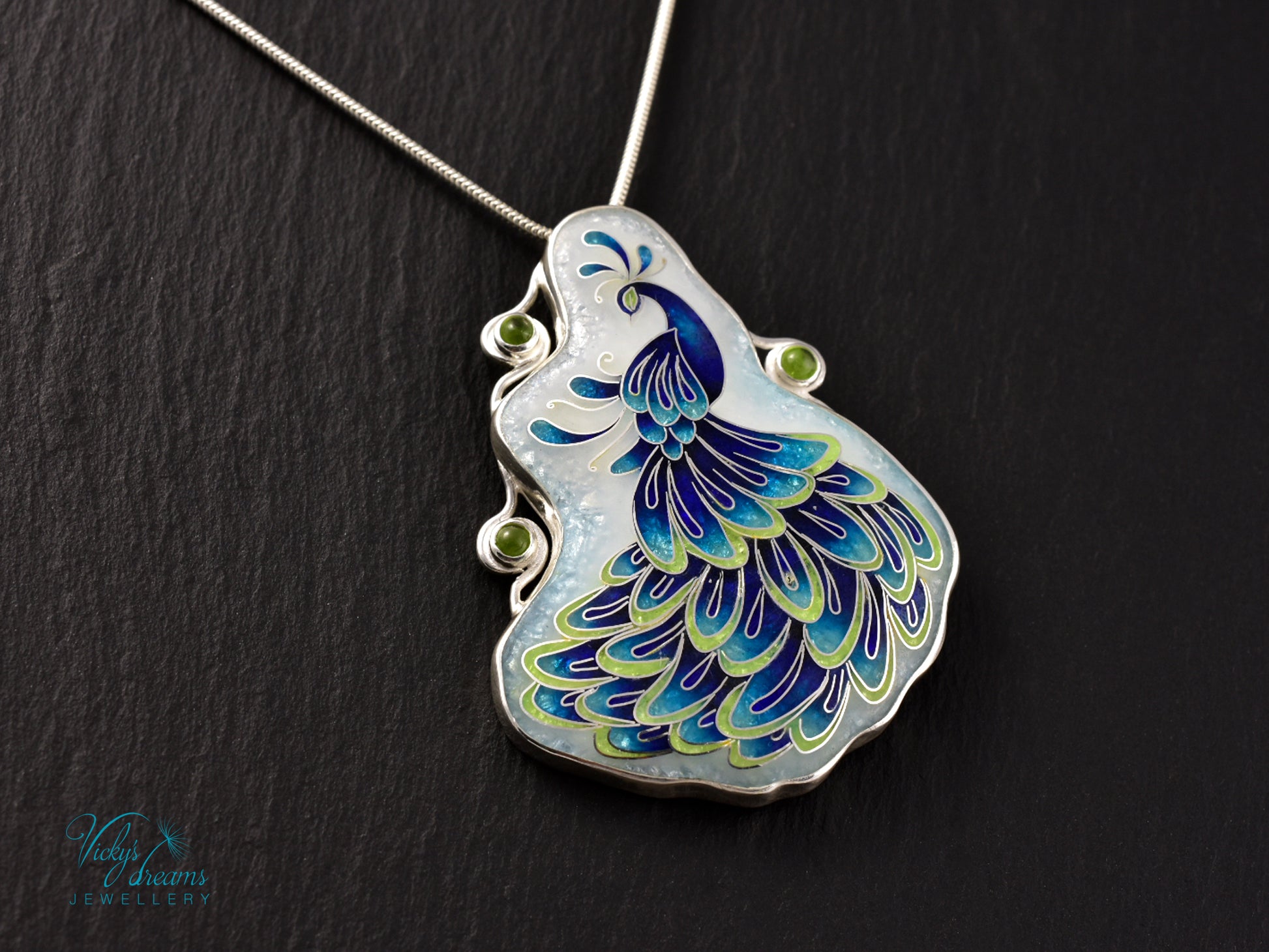 Handmade Cloisonné Enamel Peacock Necklace with Peridot – Symbol of Beauty & Protection, Sterling Silver