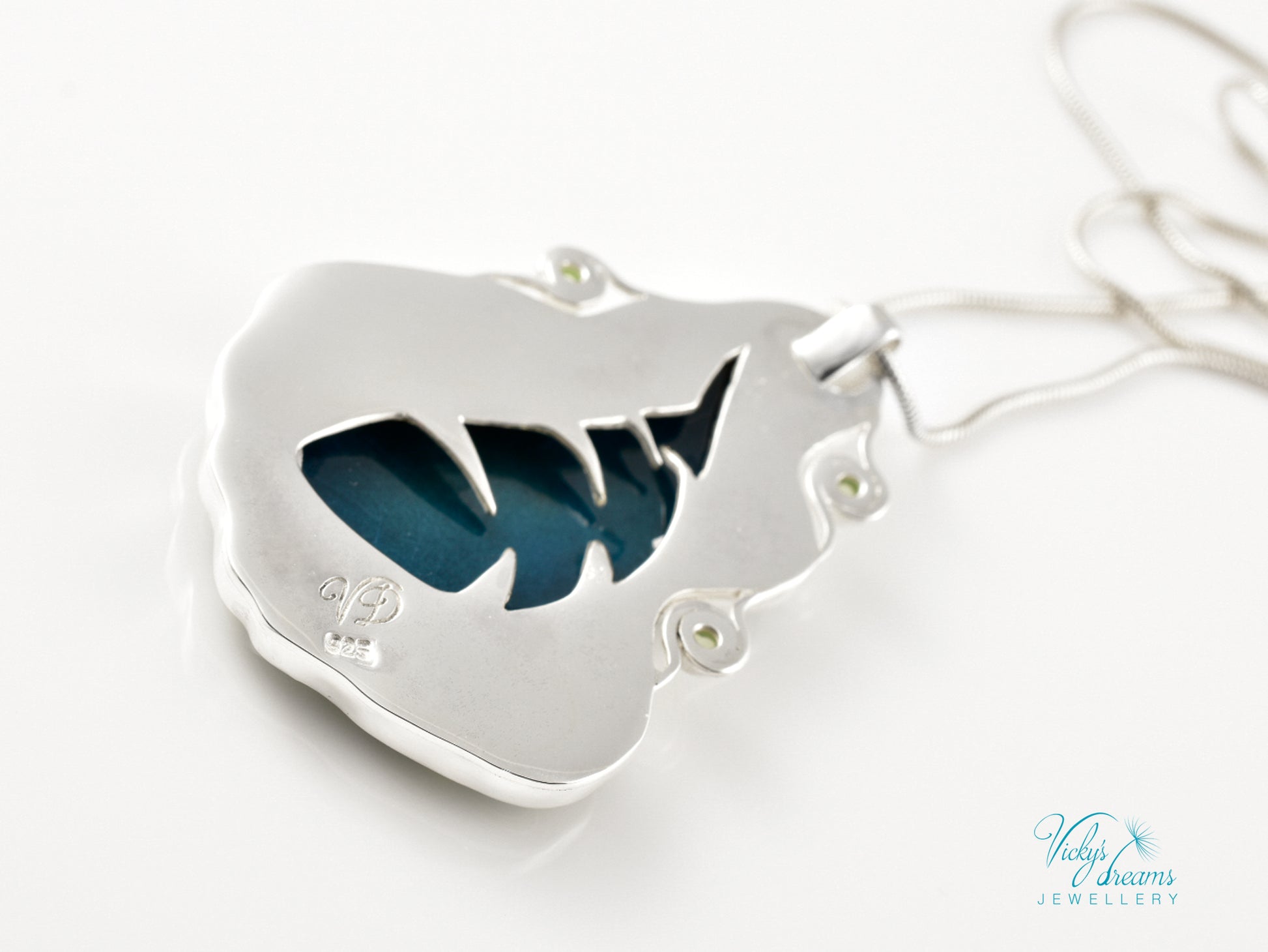 This handmade cloisonné enamel peacock necklace features vibrant blue and green colors, set in a sterling silver bezel. The peacock is a timeless symbol of beauty, dignity, protection, and spiritual awareness, encouraging self-expression and inner confidence. Three 3 mm peridot gemstones at the peacock’s tail bring harmony, positive energy, and good fortune. A meaningful talisman, perfect as a unique gift or a statement piece for yourself.