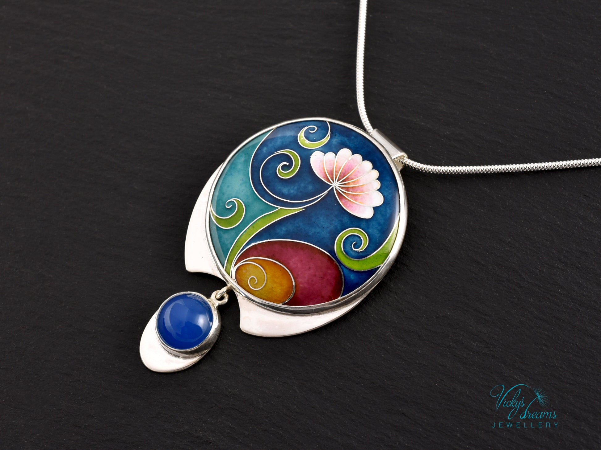 Suspended from the lower edge of the pendant is a natural blue agate gemstone, delicately set in sterling silver. Its cool, calming hue adds a grounding touch to the vibrant enamel, completing the piece with harmony and balance.