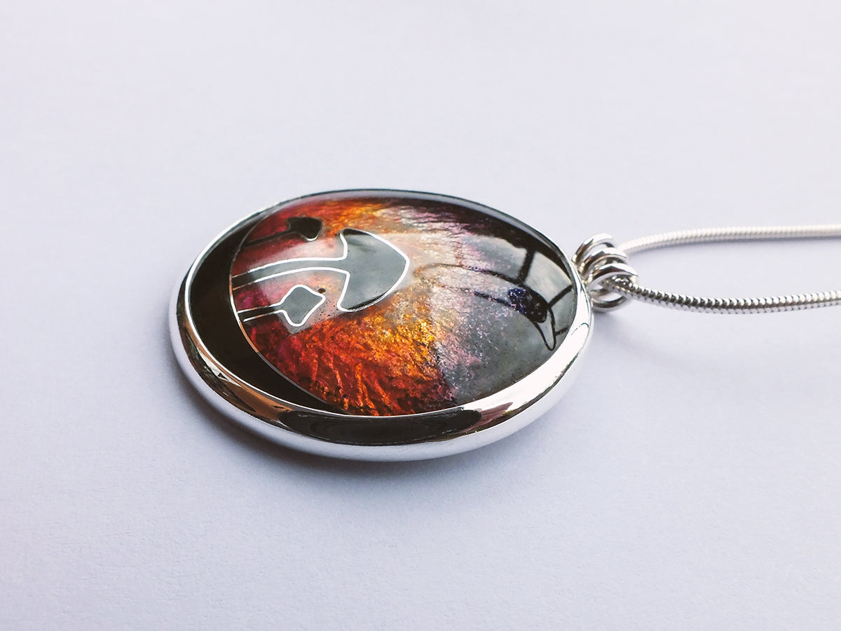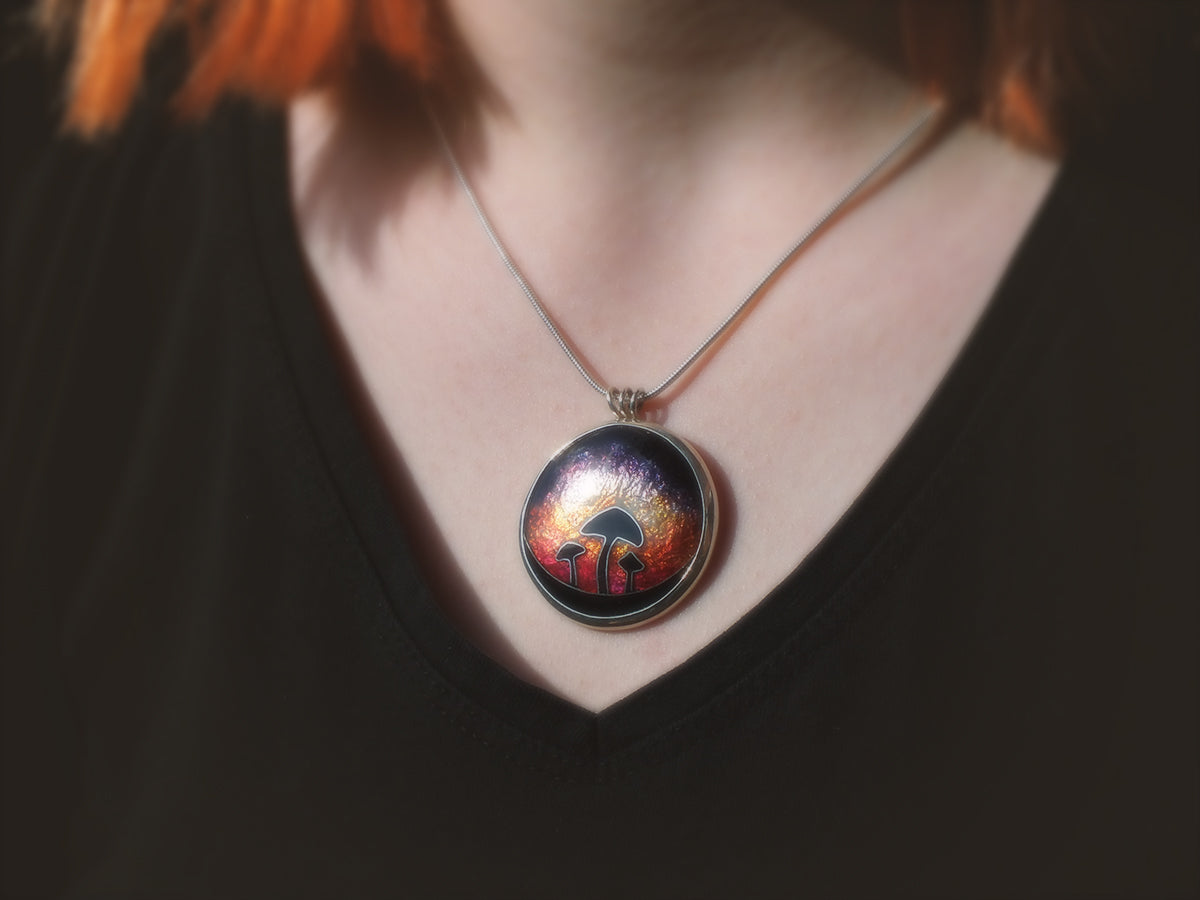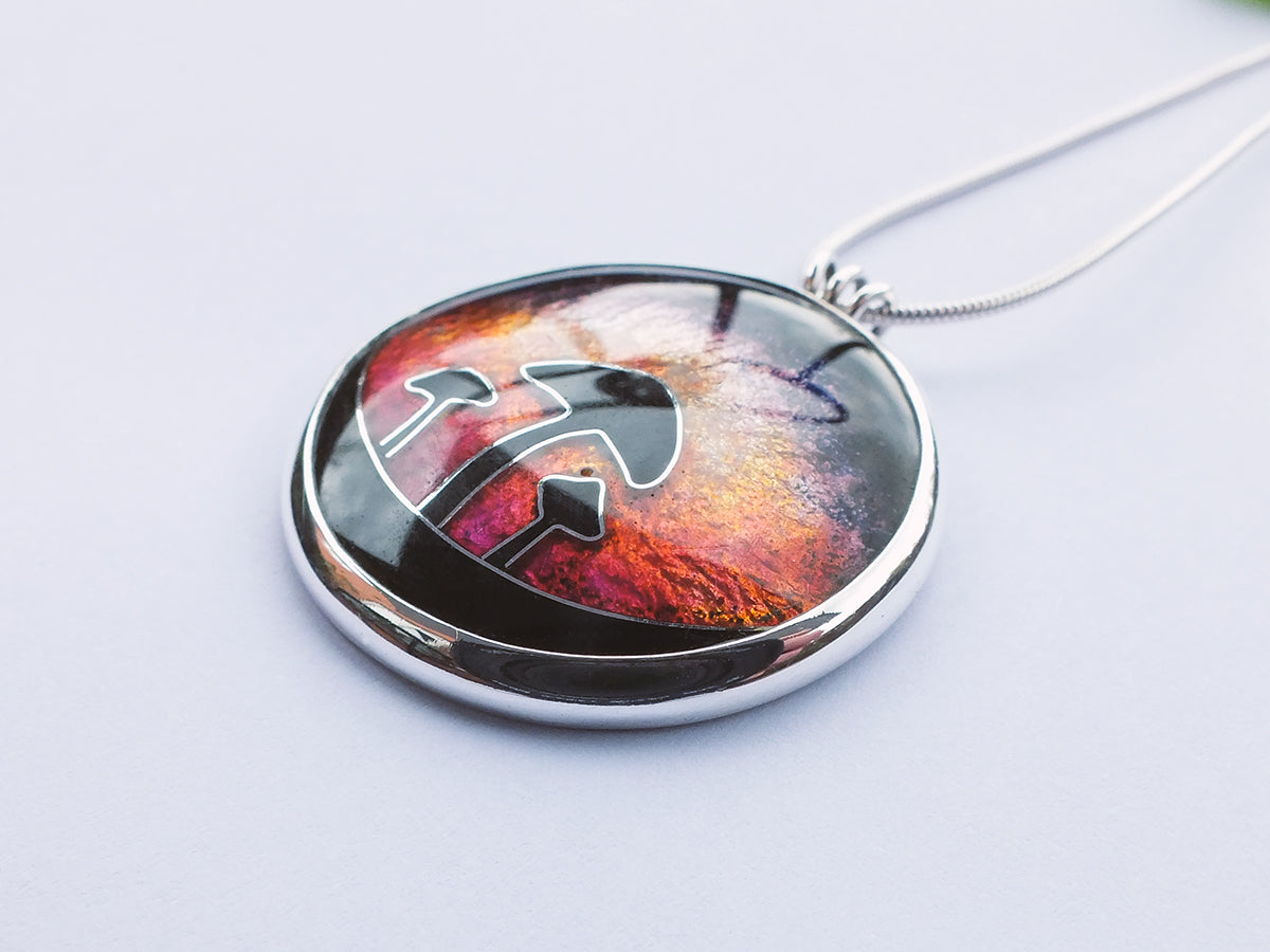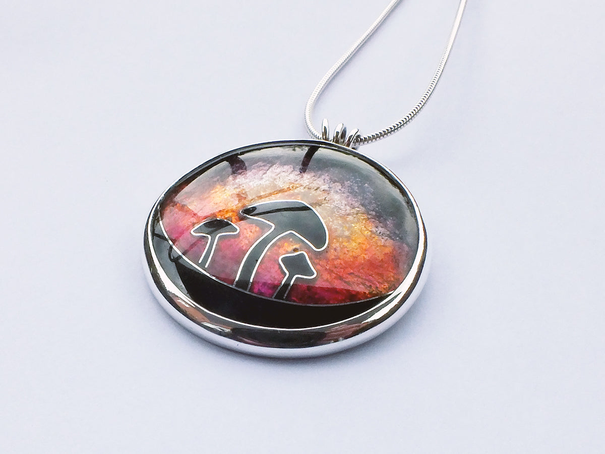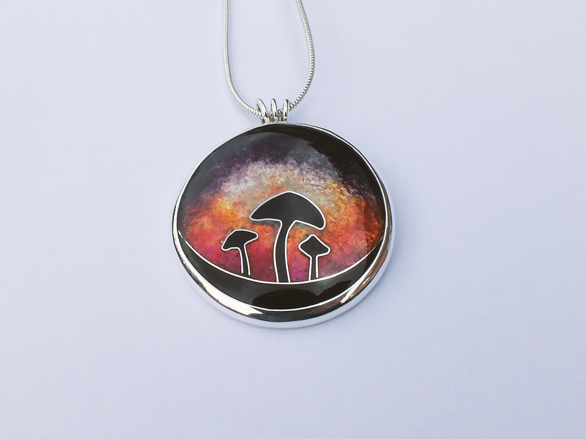 Handmade Cloisonné enamel necklace with Mushroom in sunset design, set in sterling silver bezel.