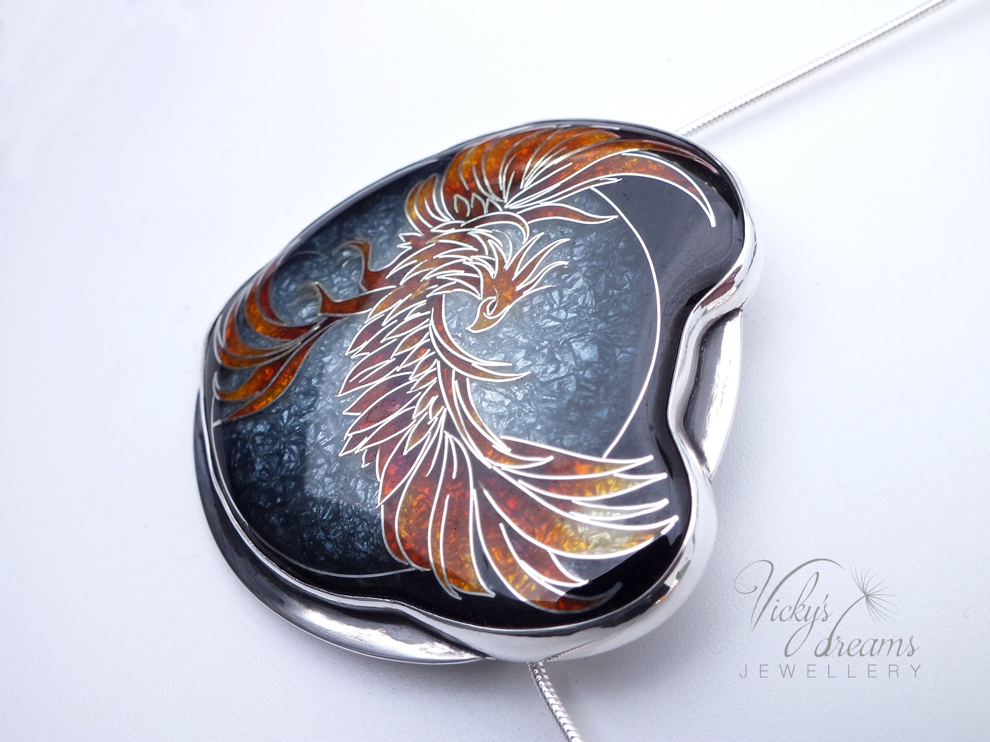 Cloisonné enamel necklace with vibrant colour phoenix design, set in sterling silver bezel.