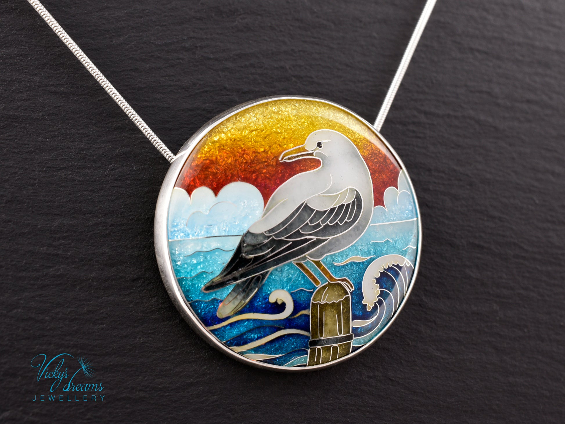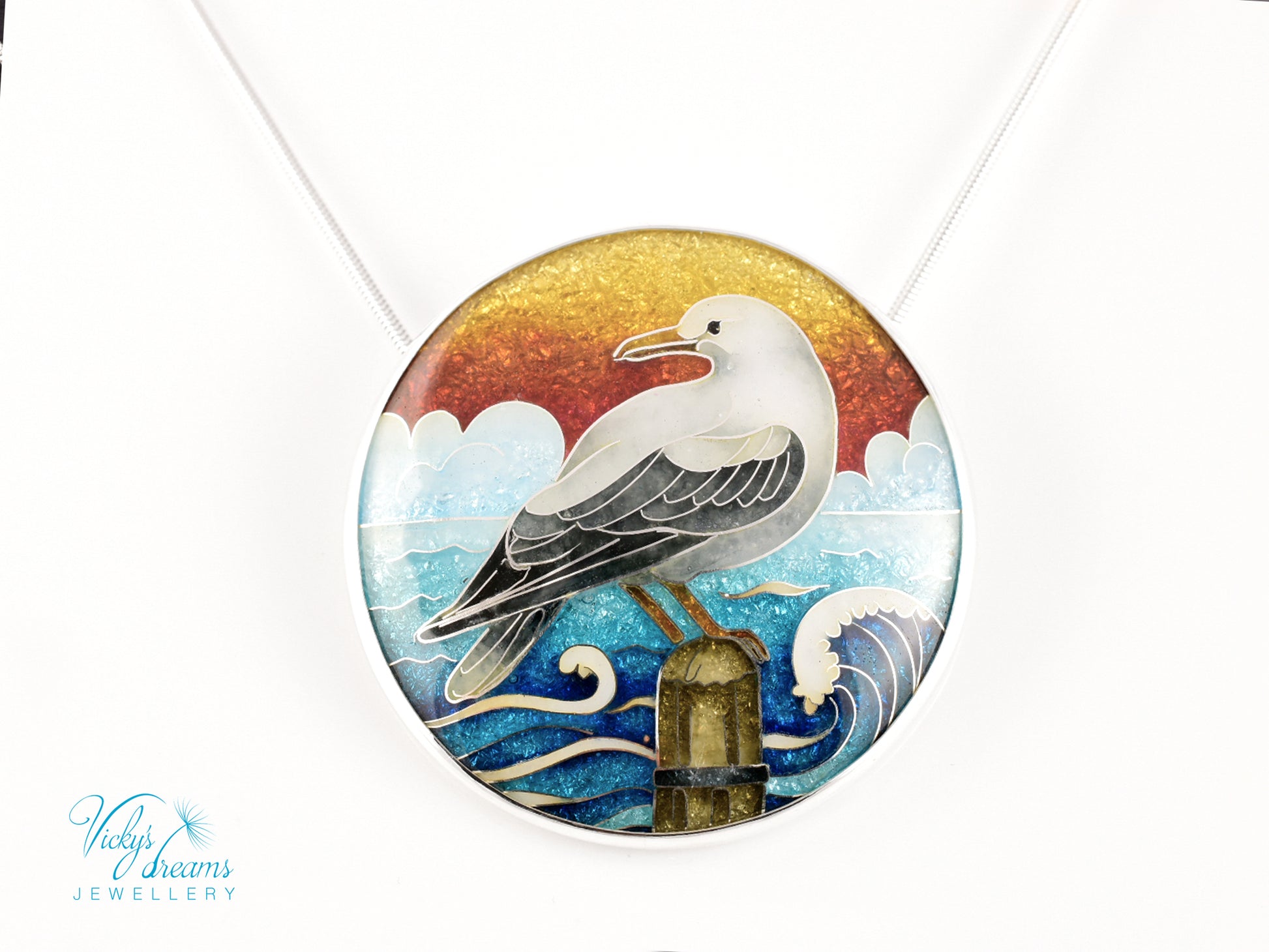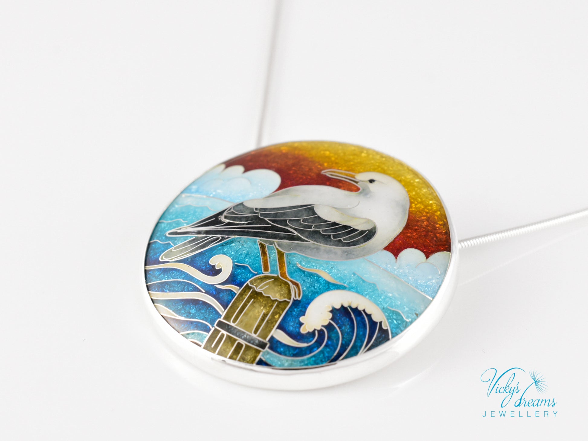 One-of-a-Kind Seagull Cloisonné Enamel Pendant – Sterling Silver Necklace