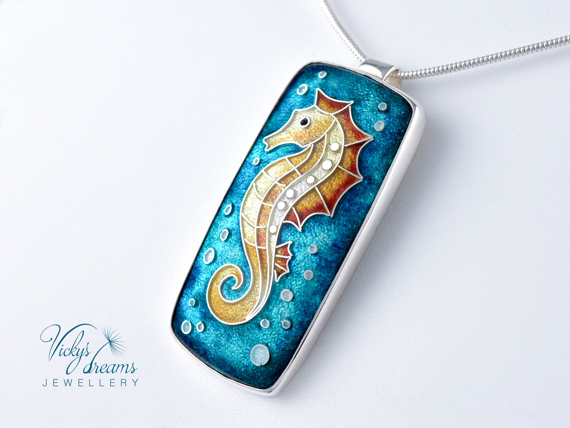 Made with love this beautiful, handmade cloisonné enamel Seahorse design pendant, set in silver bezel.
