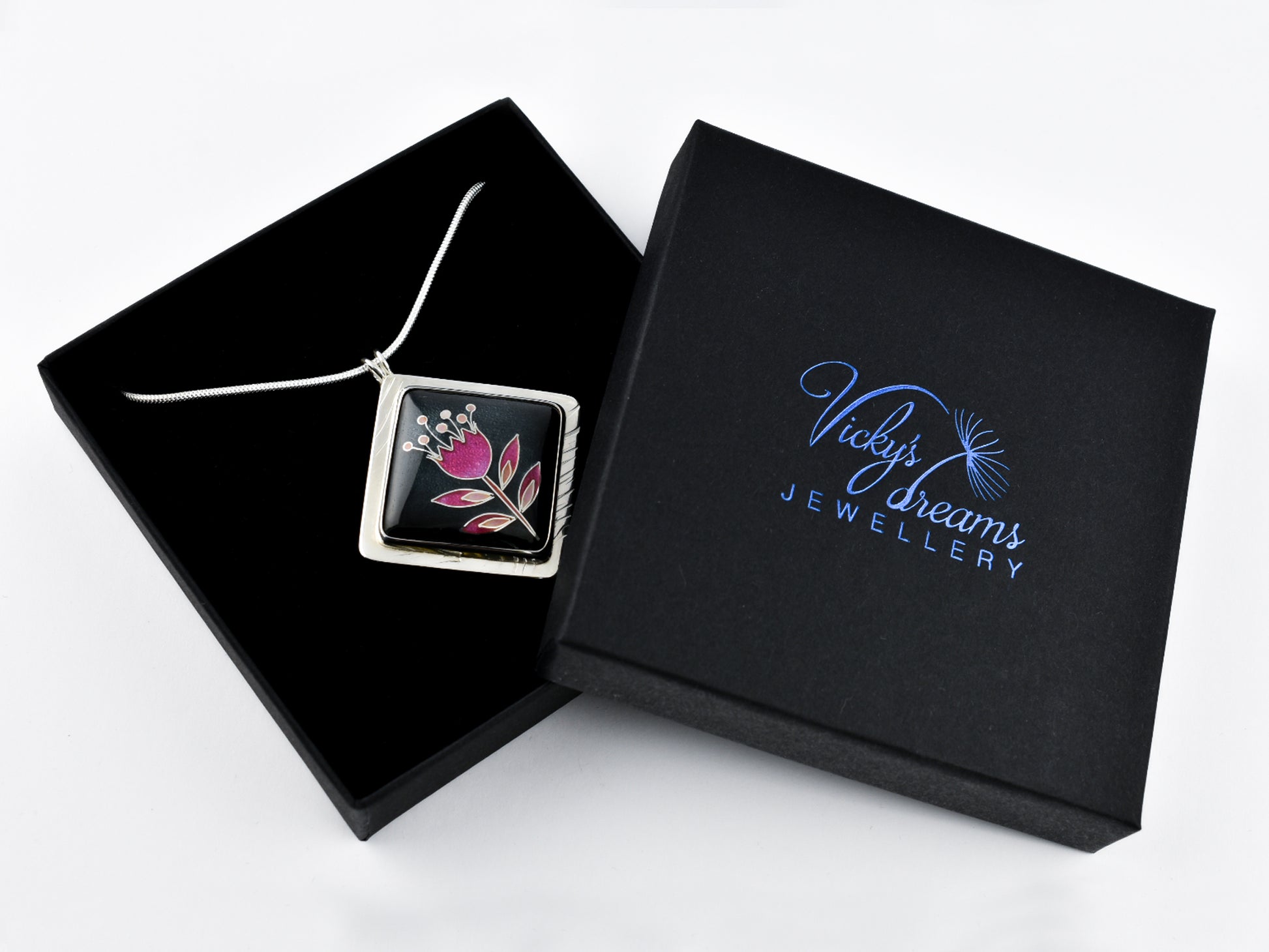 DELIGHTED with my charming little pink flower folkloric silver pendant. The clarity of the cloisonne and quality is excellent. It came beautifully gift wrapped and even included a cleaning cloth. Great seller. Thank-you.