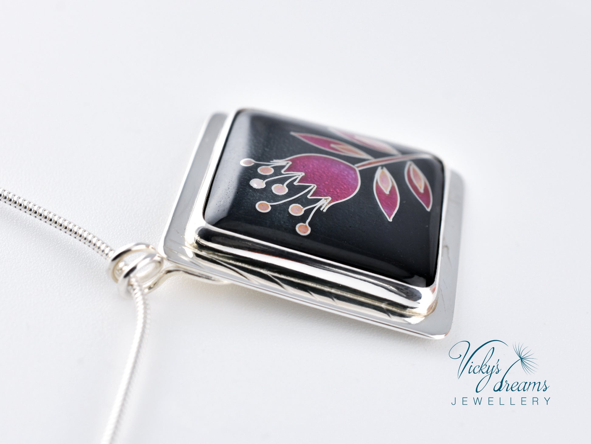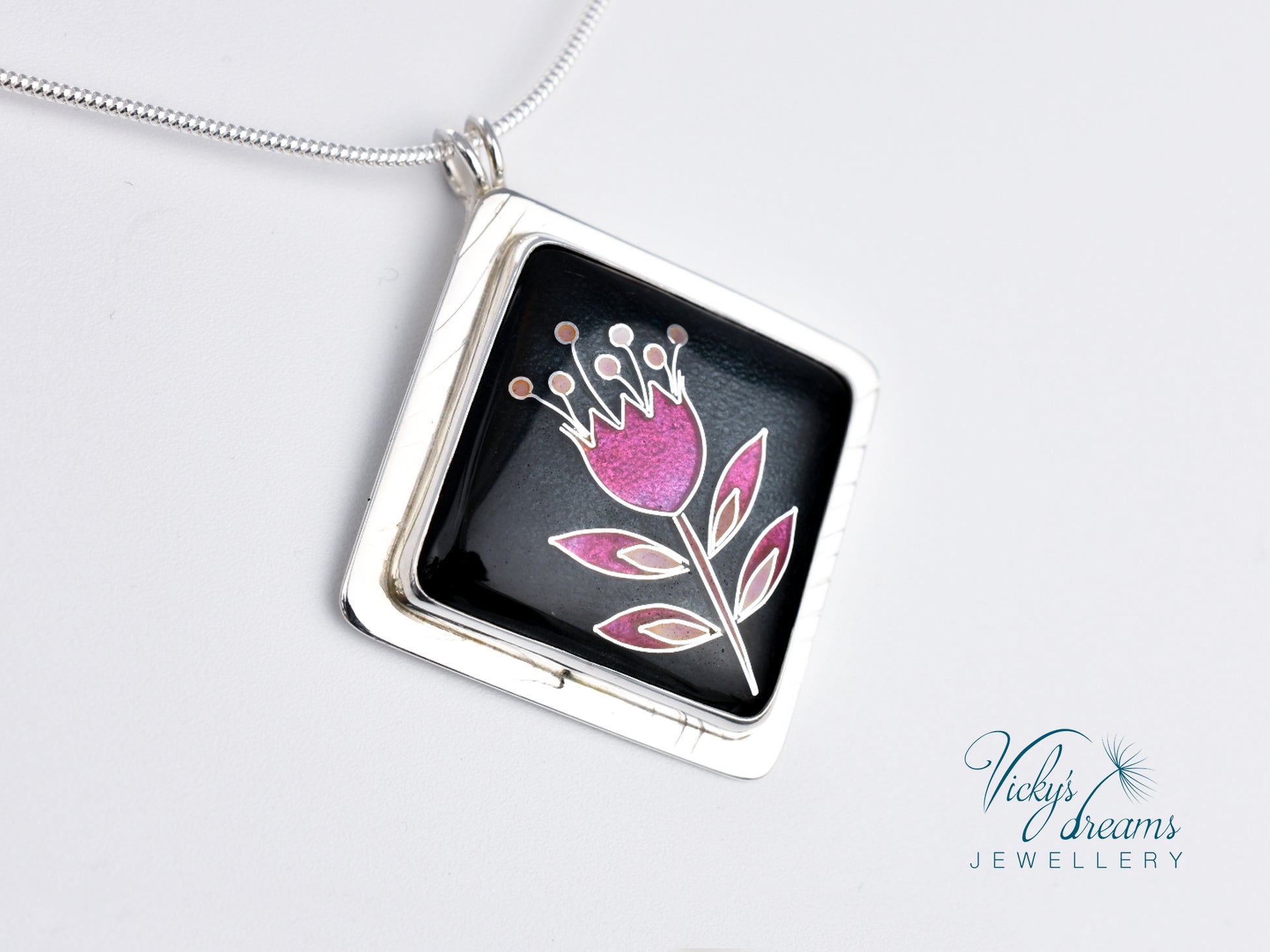 Cloisonné enamel necklace with simple pink flower design, set in sterling silver bezel.