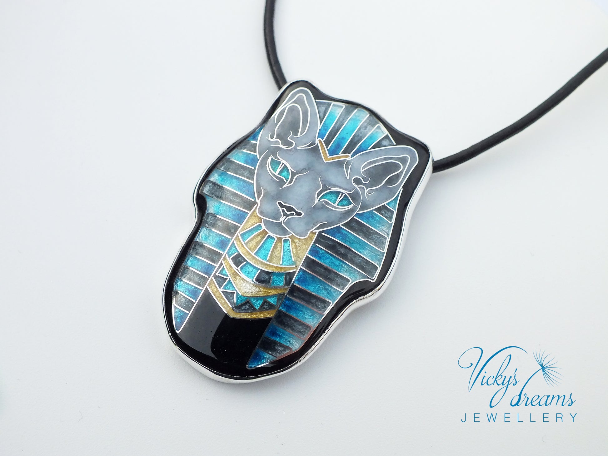 Handmade Cloisonné enamel pendant with Sphynx cat design, set in sterling silver bezel.
