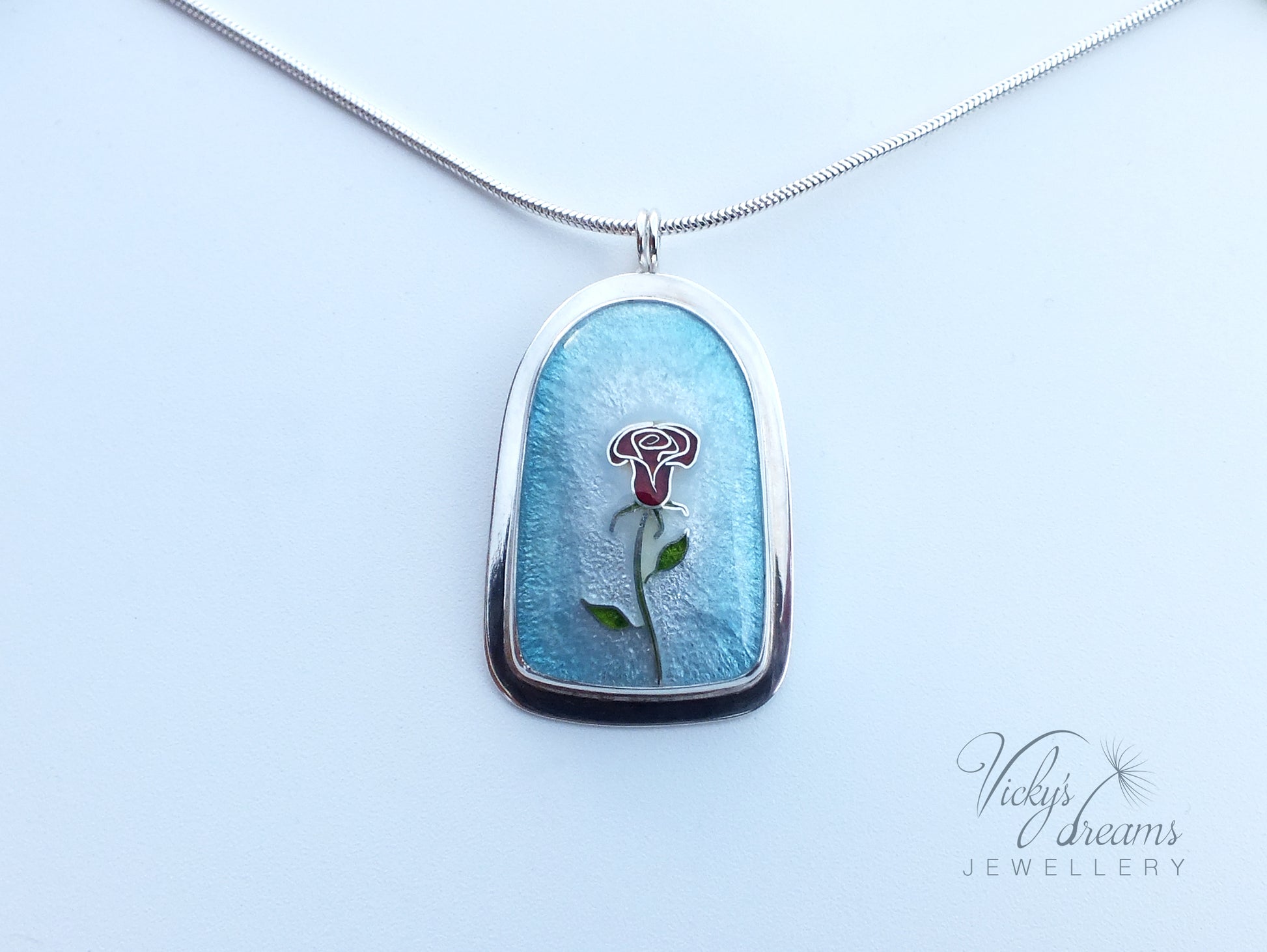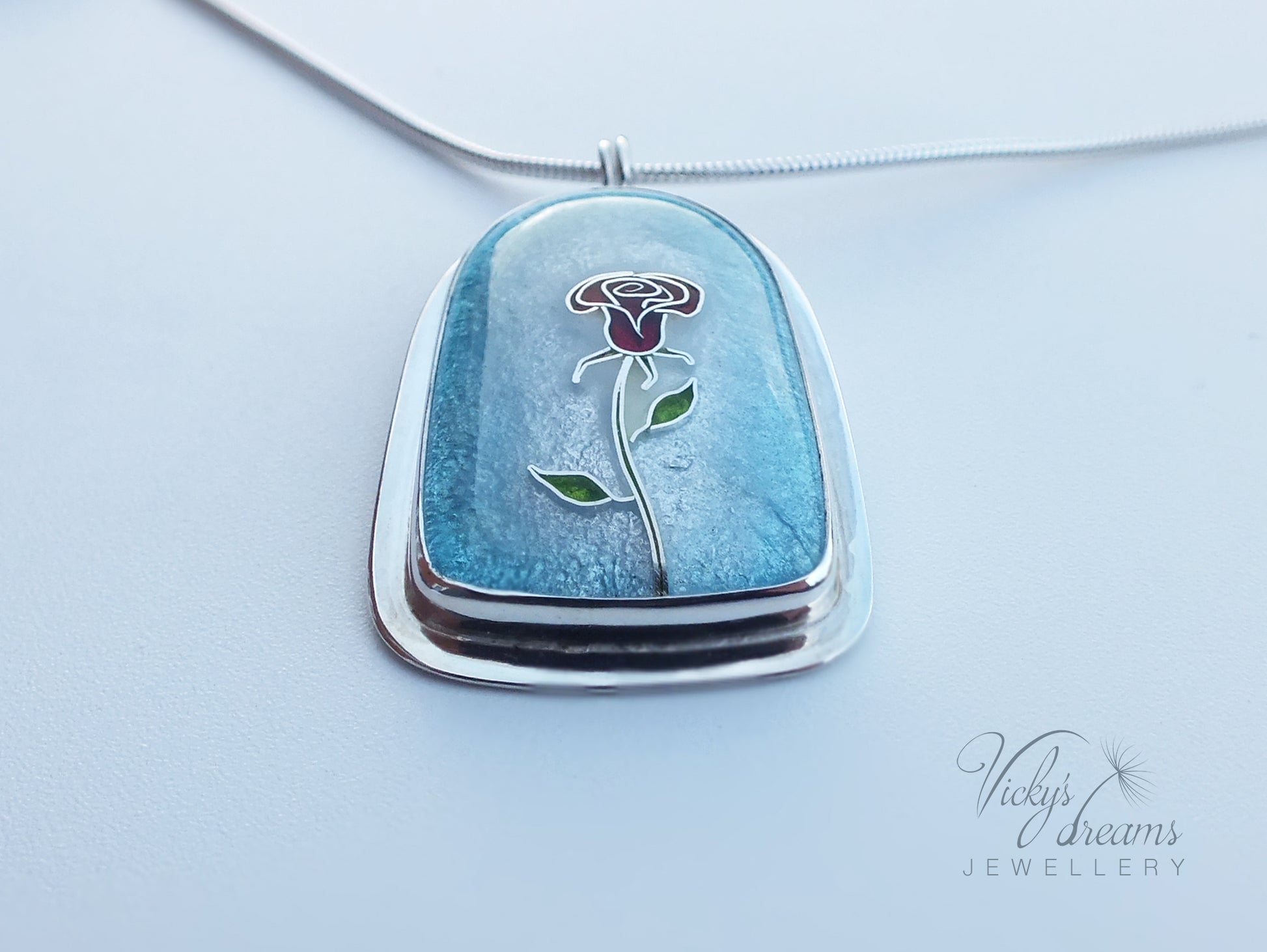 Handmade Cloisonné enamel pendant The Little Prince's rose design, set in sterling silver bezel.