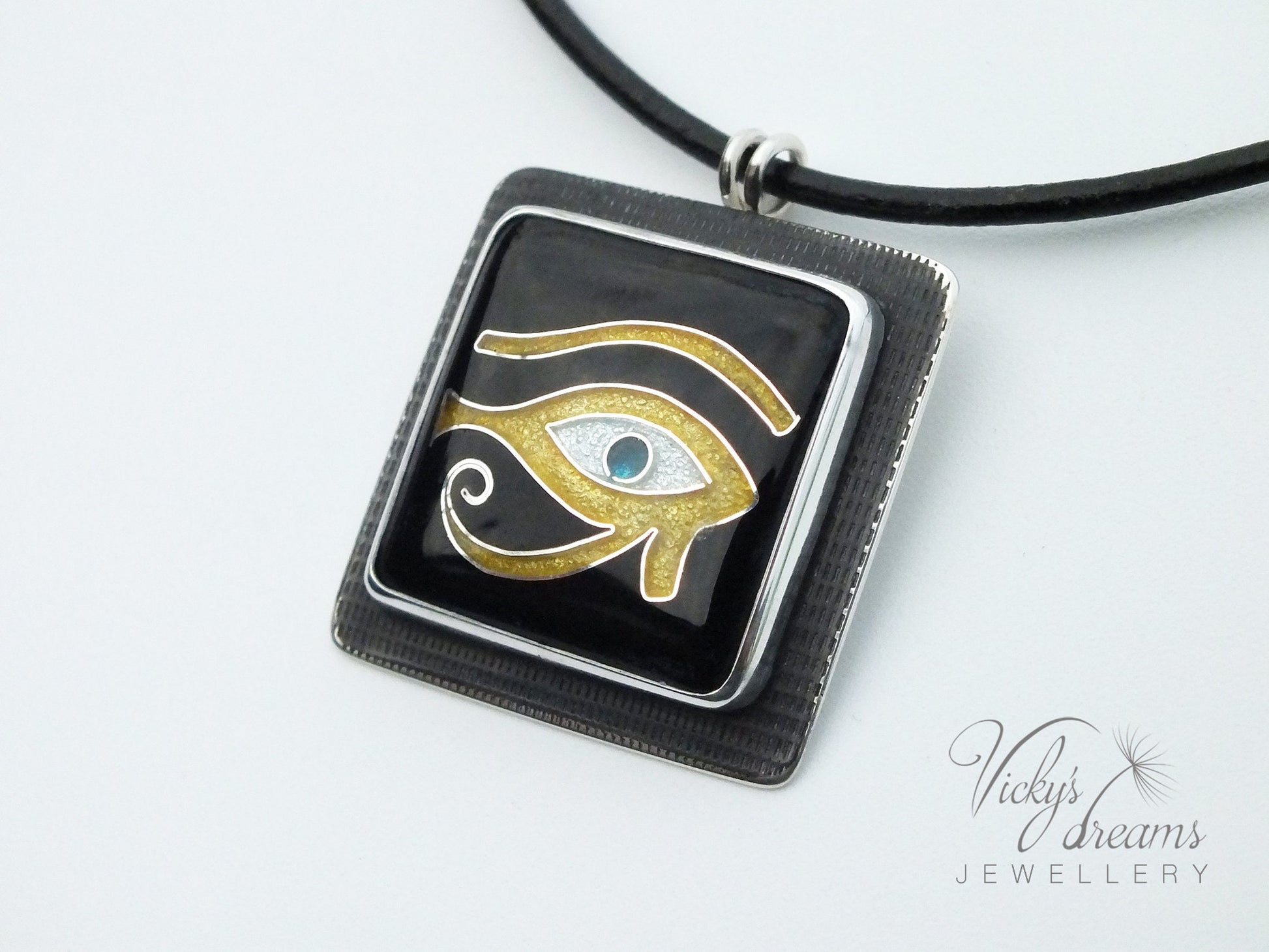 Handmade Cloisonné enamel necklace with Horus eye design, set in sterling silver bezel (oxidised to highlight the pattern).