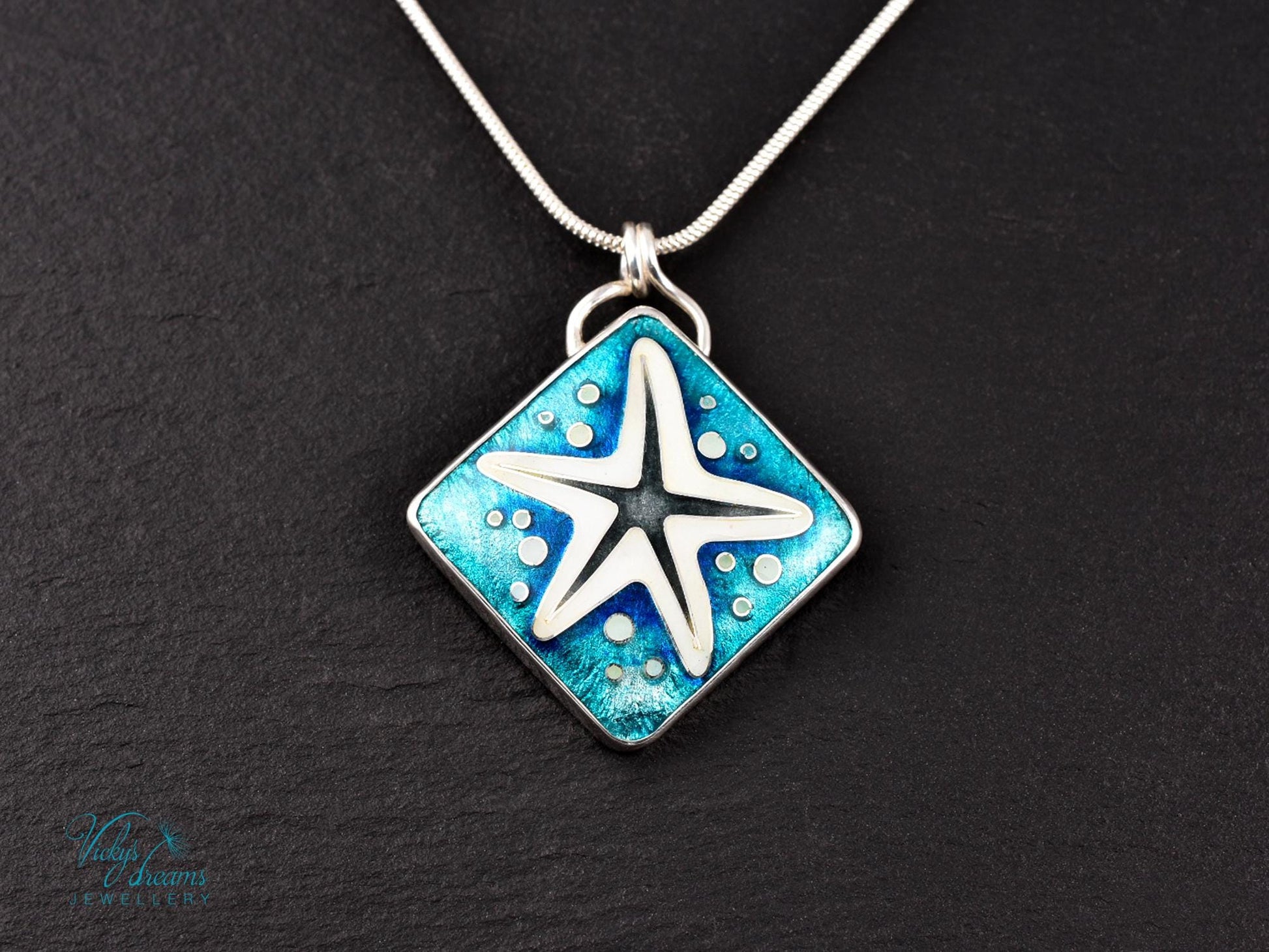 This cloisonné enamel pendant captures the magic of the sea with a dreamy starfish in ocean blue and ivory tones. Created using the ancient technique of cloisonné, powdered glass is delicately fused within fine silver cells, forming a glossy, jewel-like surface that shimmers with depth and light.
