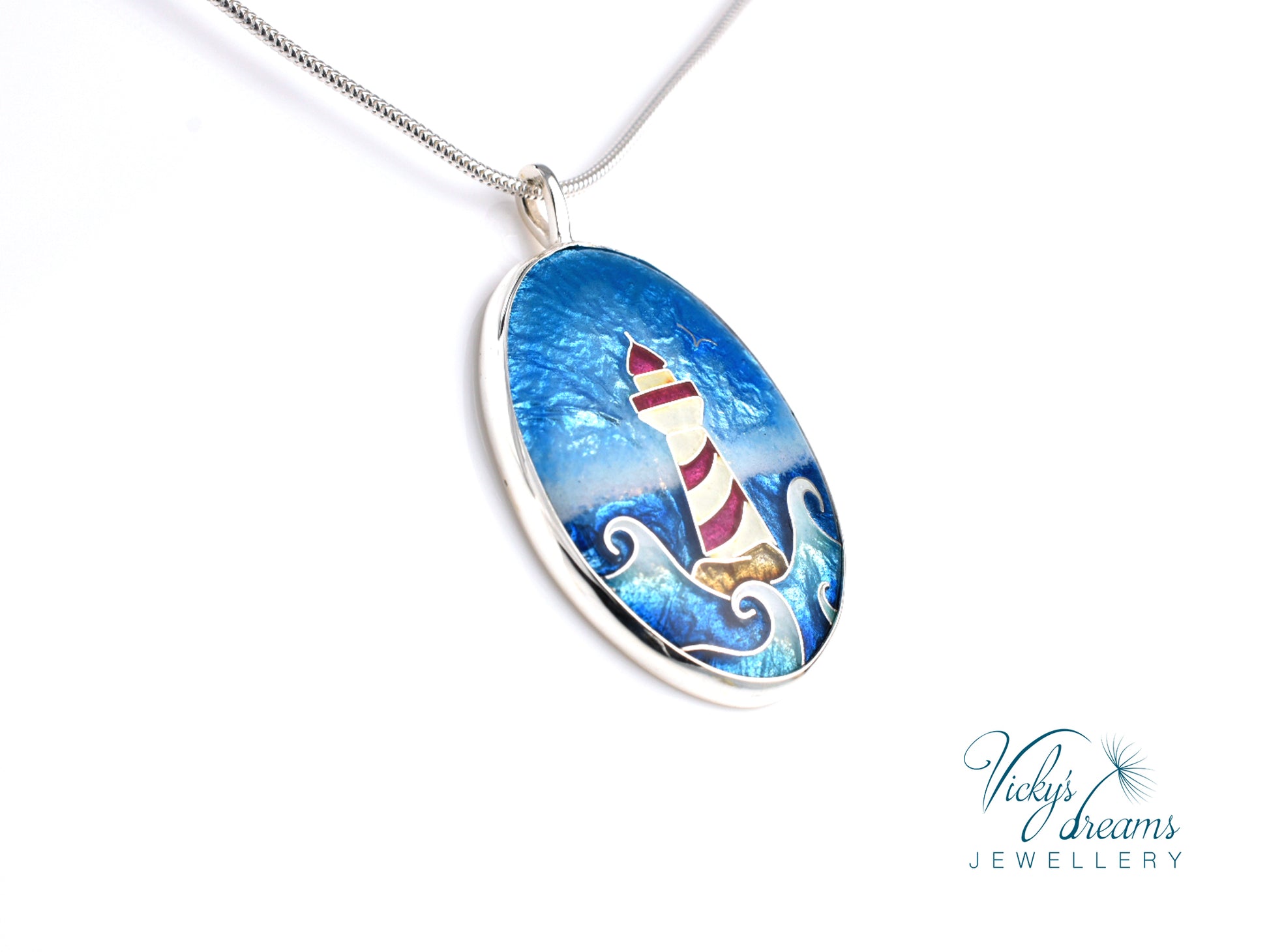 Cloisonné enamel necklace with vibrant colour lighthouse design, set in sterling silver bezel.