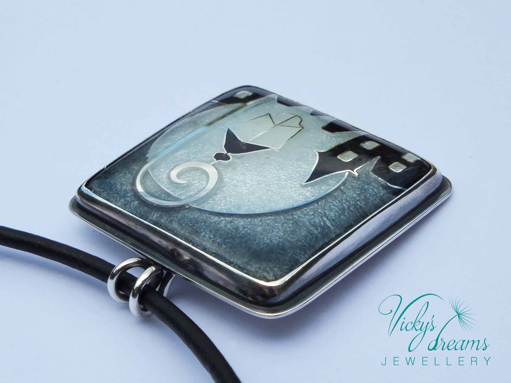 Handmade Cloisonné enamel pendant with Village at night design, set in sterling silver bezel (+ antique effect).